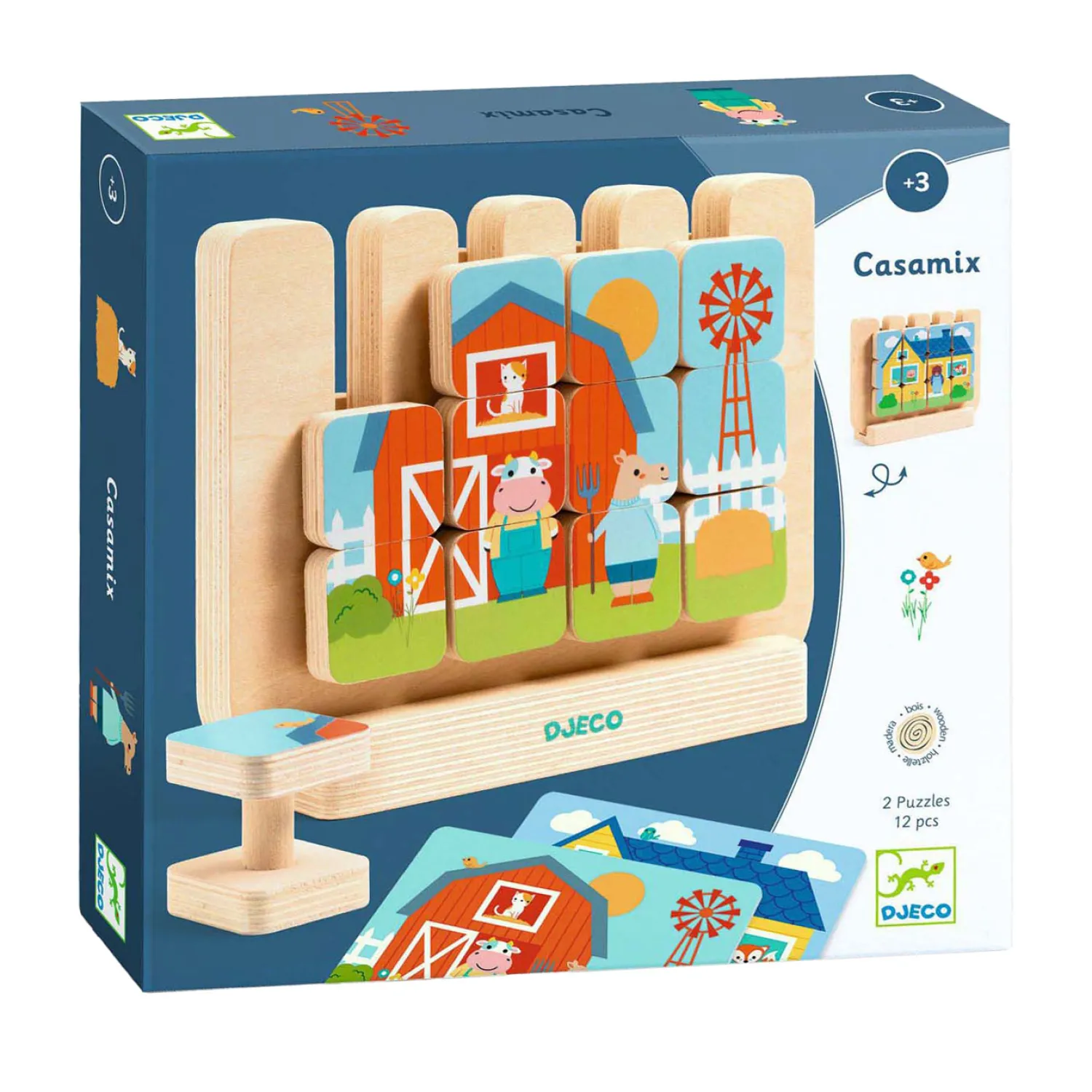 Het kind kiest een van de twee modellen, selecteert de juiste houten stukken en legt ze op de plaat om de afbeelding op de kaart perfect na te maken.