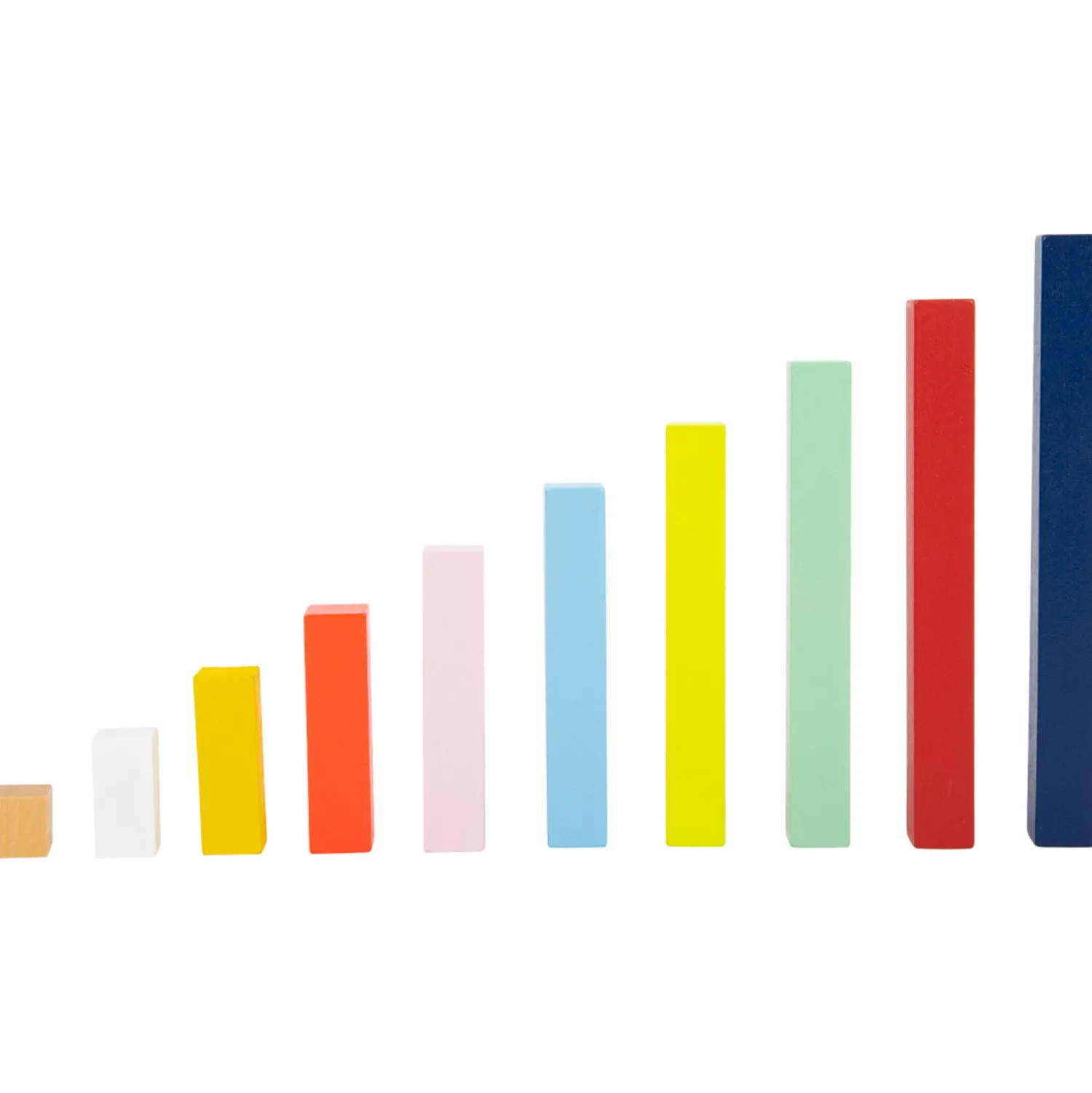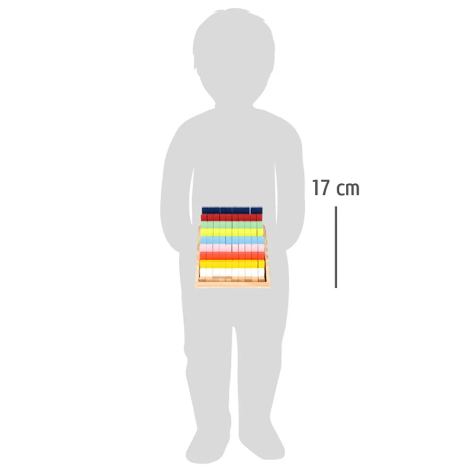 Gebruik de staven bijvoorbeeld bij het leren van breuken. Als voorbeeld kun je 1/10 uitleggen met de langste staaf en de 10 kleinste blokjes. Als je de 10 kleinste blokjes opstapelt, heeft dit dezelfde lengte als de donkerblauwe staaf. Haal steeds een blokje weg en vertel de eerste paar keer zelf waar het aan gelijk staat: “Dit is 9/10, dit 8/10,…”. Vraag daarna aan de kinderen wat de breuk nu is als je nog een blokje weghaalt. Maak het steeds een stapje moeilijker door verschillende breuken weer te geven.