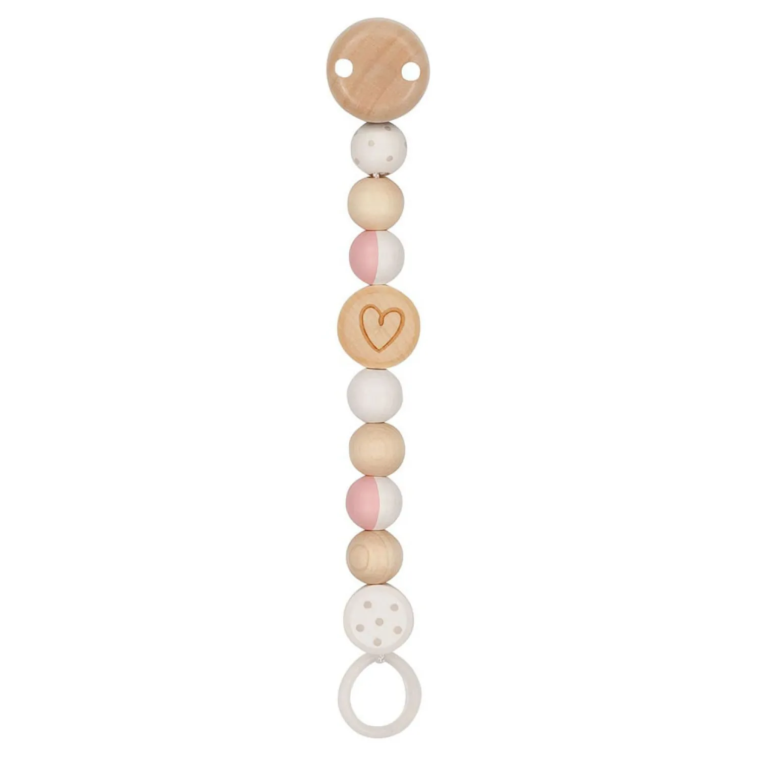 de fopspeen niet kwijt raakt en door ermee te kunnen spelen, houd je de baby blij. Deze ketting heeft mooie roze accenten.