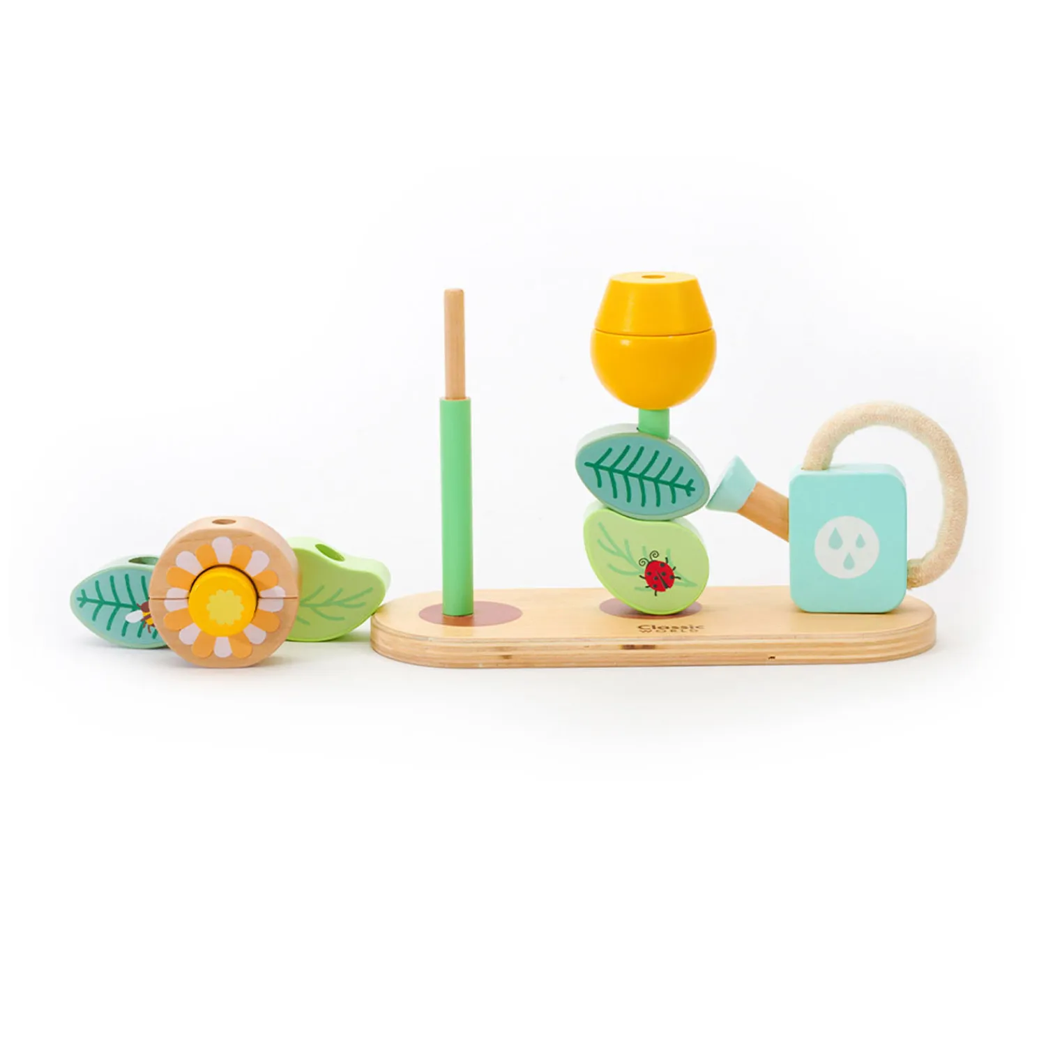 Met stevige, houten puzzelstukken in de vorm van bloemetjes en blaadjes creëert je kindje met zijn of haar groene vingertjes de mooiste bloemcreaties. De stukken zijn onderling te mixen & matchen, waardoor de creativiteit volop aangewakkerd wordt. Deze houten stapelpuzzel voor baby’s en peuters bestaat uit 9 puzzelstukken, een basis om ze op te zetten en een houten gieter.