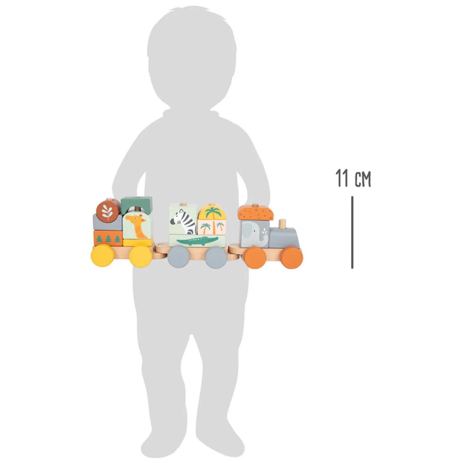 Afmetingen: treinwagons ca. 12 x 7 x 11 cm; kubussen ca. 4 x 3,5 x 4 cm. Geschikt voor kinderen vanaf 12 maanden oud.