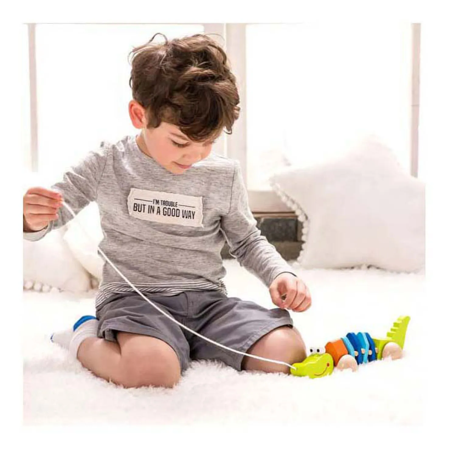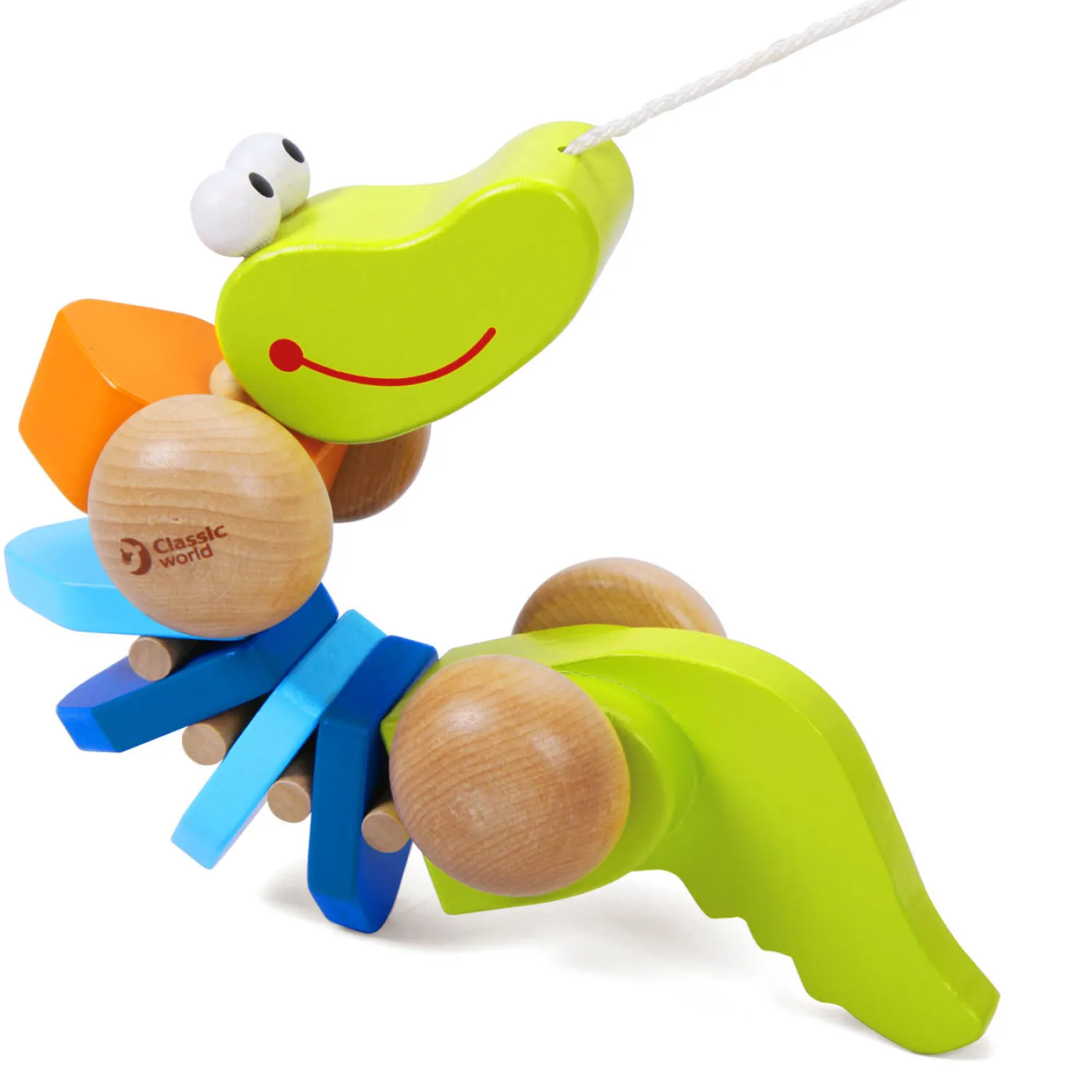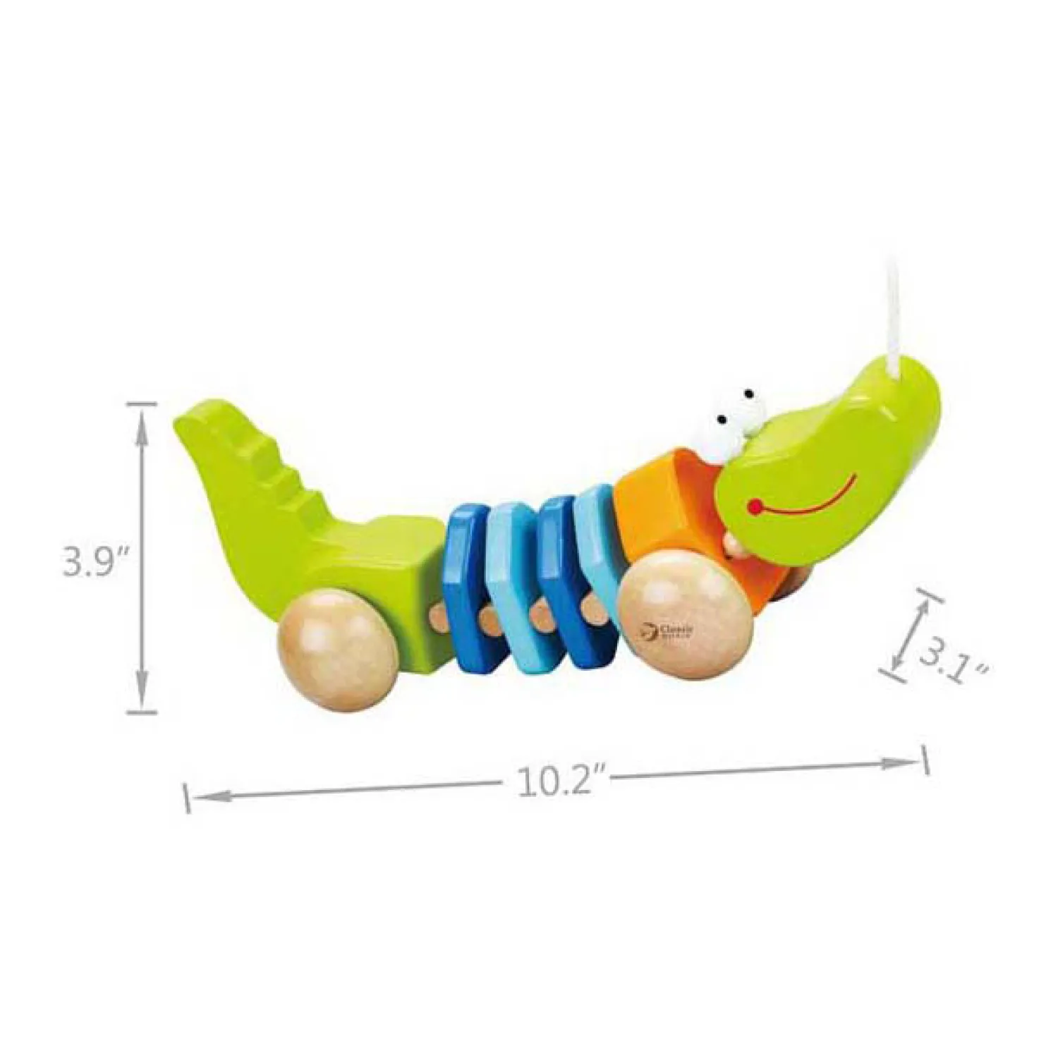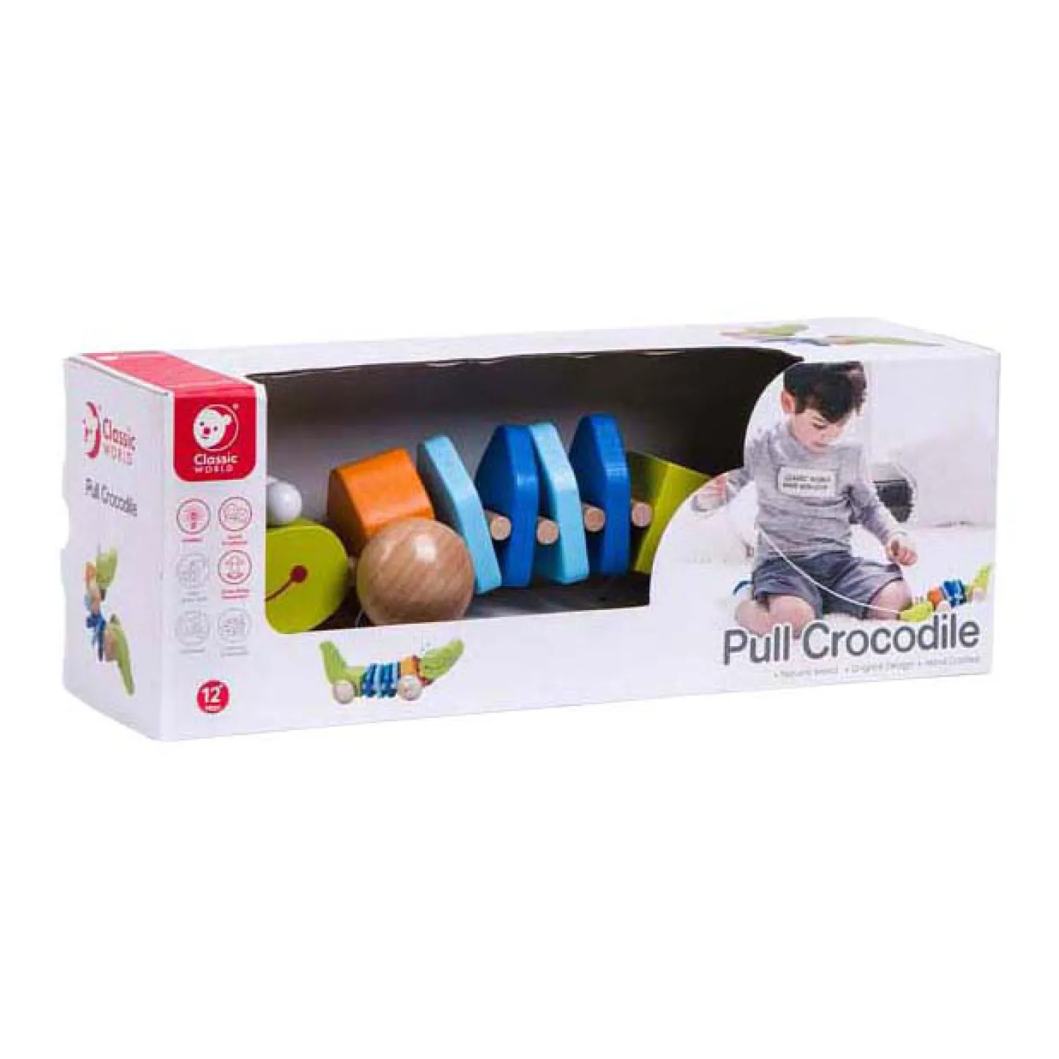 Classic World houten trekdier in de vorm van een krokodil. Wandelen is veel leuker al je een vriendje mee mag trekken! De krokodil waggelt, is voorzien van vrolijke kleuren en houten wielen. Geschikt voor kinderen vanaf 12 maanden.