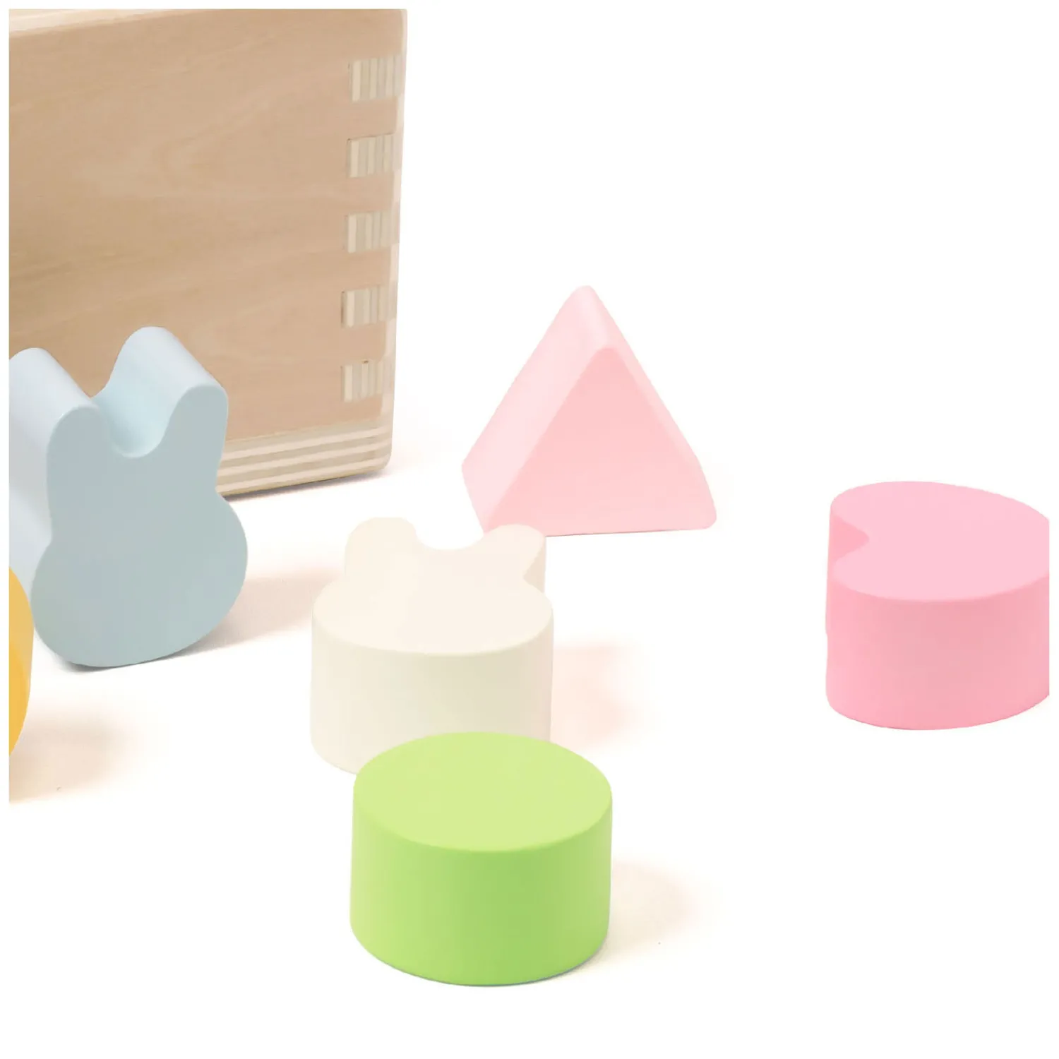 Deze leuke, houten box bevat een nog leukere inhoud! De deksel van de houten doos bevat 4 verschillende vormen: een cirkel, konijntje, hartje en driehoek. Probeer de juiste figuurtjes in de juiste vorm op de deksel te krijgen. Met dit spel leren kinderen vanaf 12 maanden de verschillende vormen en hun grijpvaardigheid.