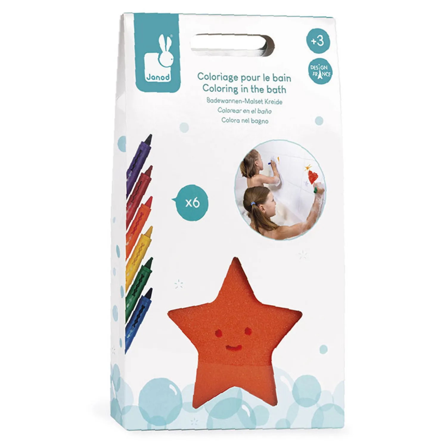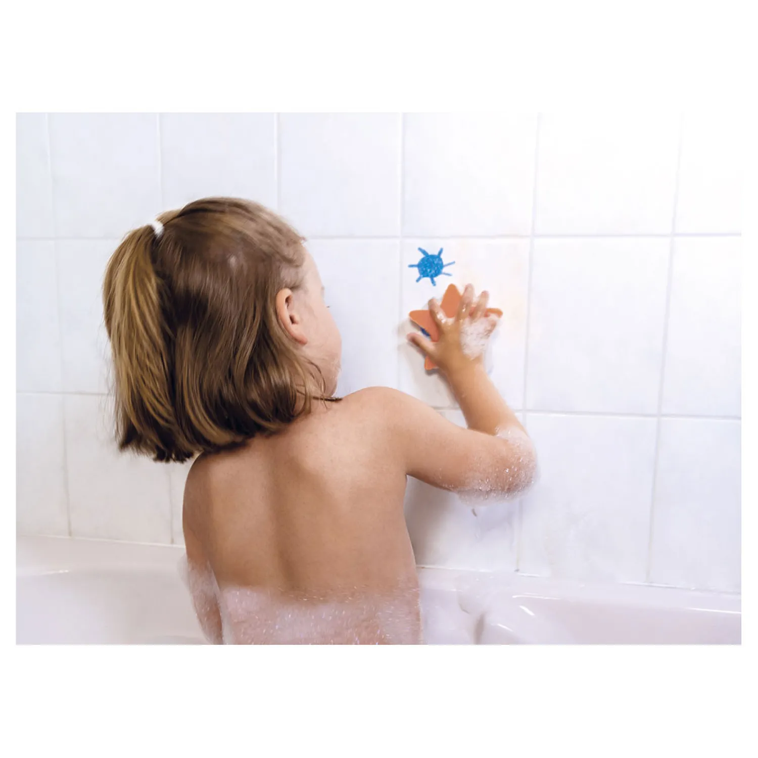 Voor kinderen vanaf 3 jaar 6 krijtjes en een spons in de vorm van een zeester om op het bad te tekenen, te wissen en telkens weer opnieuw te beginnen!