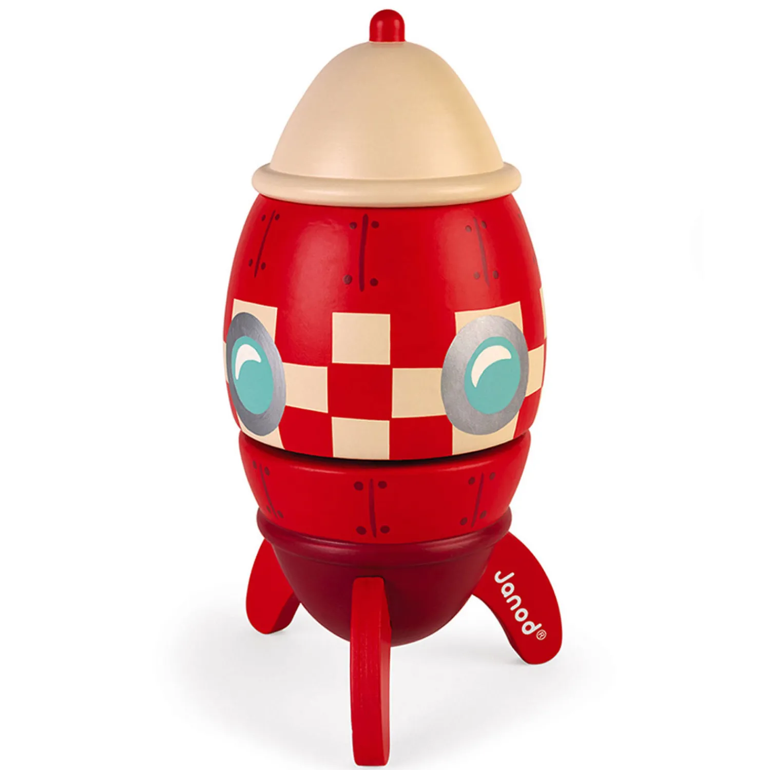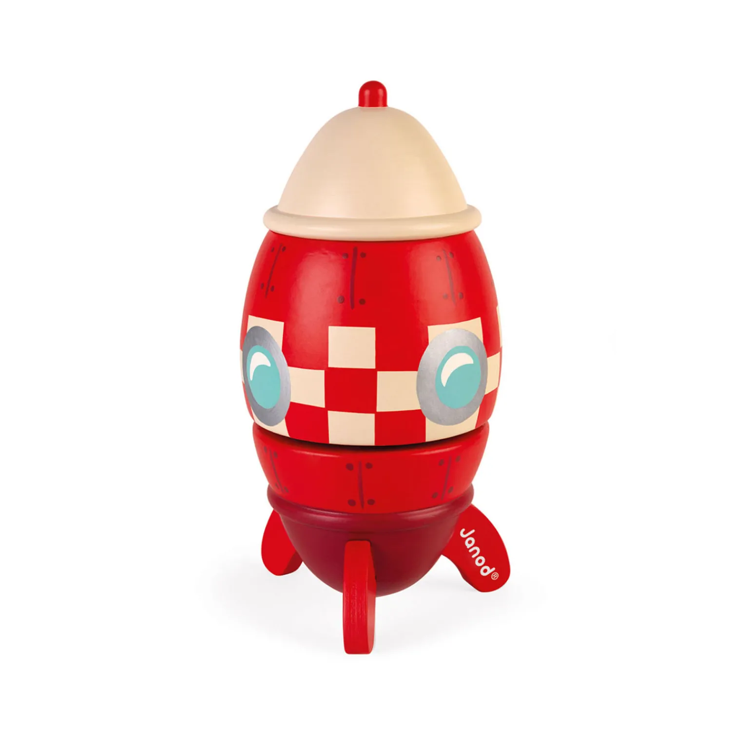 Stoer houten muziekdoosje van Janod in de vorm van een raket. De rode raket speelt de melodie Twinkle Twinkle Little Star. De hoogte van het muziekdoosje is 17 centimeter. De doorsnede is ongeveer 9 centimeter.