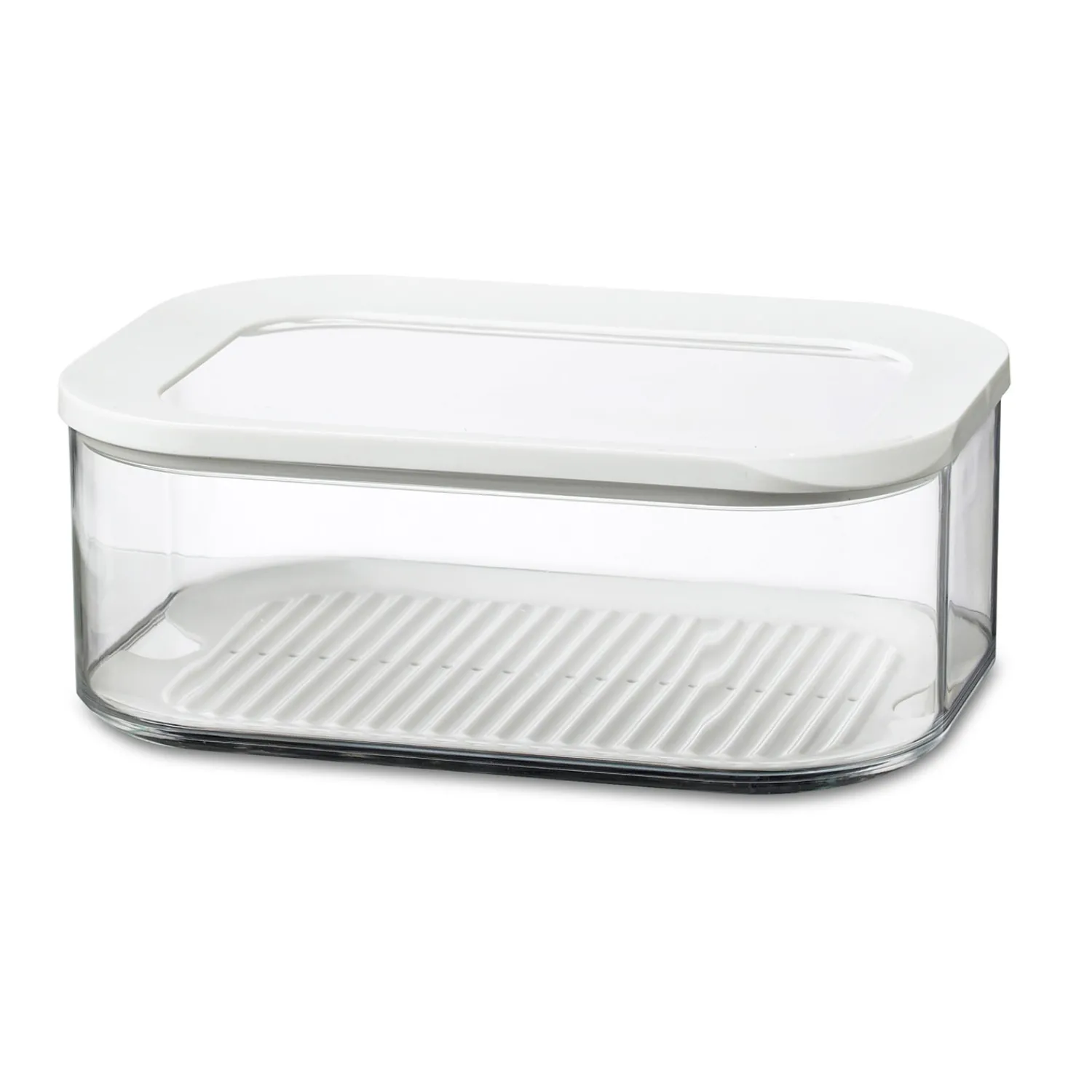 Kaasdoos Modula, voorzien van een doorzichtige deksel met witte ring. De rechthoekige Modula kaasdoos met afgeronde hoeken heeft een inhoud van 2000 ml, is standaard voorzien van een anticondens tray en geeft direct zicht op inhoud, ook in de koelkast! De witte afdichtring zorgt voor een luchtdichte afsluiting, waardoor deze doos geschikt is voor het bewaren van diverse kaassoorten. De Modula bewaar- en opbergdozen van Rosti Mepal zijn verkrijgbaar in verschillende maten en uitvoeringen, liggen goed in de hand en zijn makkelijk te openen. Bovendien zijn ze stapelbaar en vaatwasmachinebestendig. Hoe veeleisend u ook bent: Modula bewaardozen zijn erop berekend!