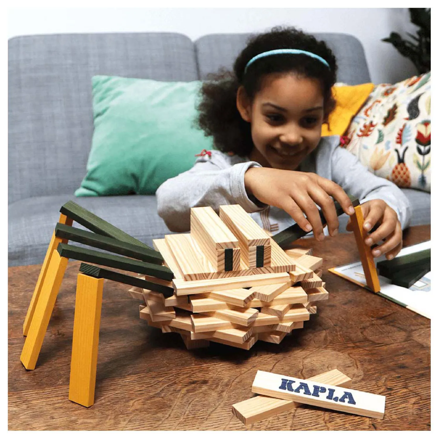 Deze houten kist bevat een selectie van 75 blanke en gekleurde plankjes (55x blank, 10x geel en 10x groen), tot grote vreugde van alle kinderen vanaf 2 jaar. Het kistje wordt afgesloten door een schuifdeksel met op de achterkant een gedetailleerd stappenplan die bouwers vanaf 4 jaar begeleiden om een mooie spin te maken.