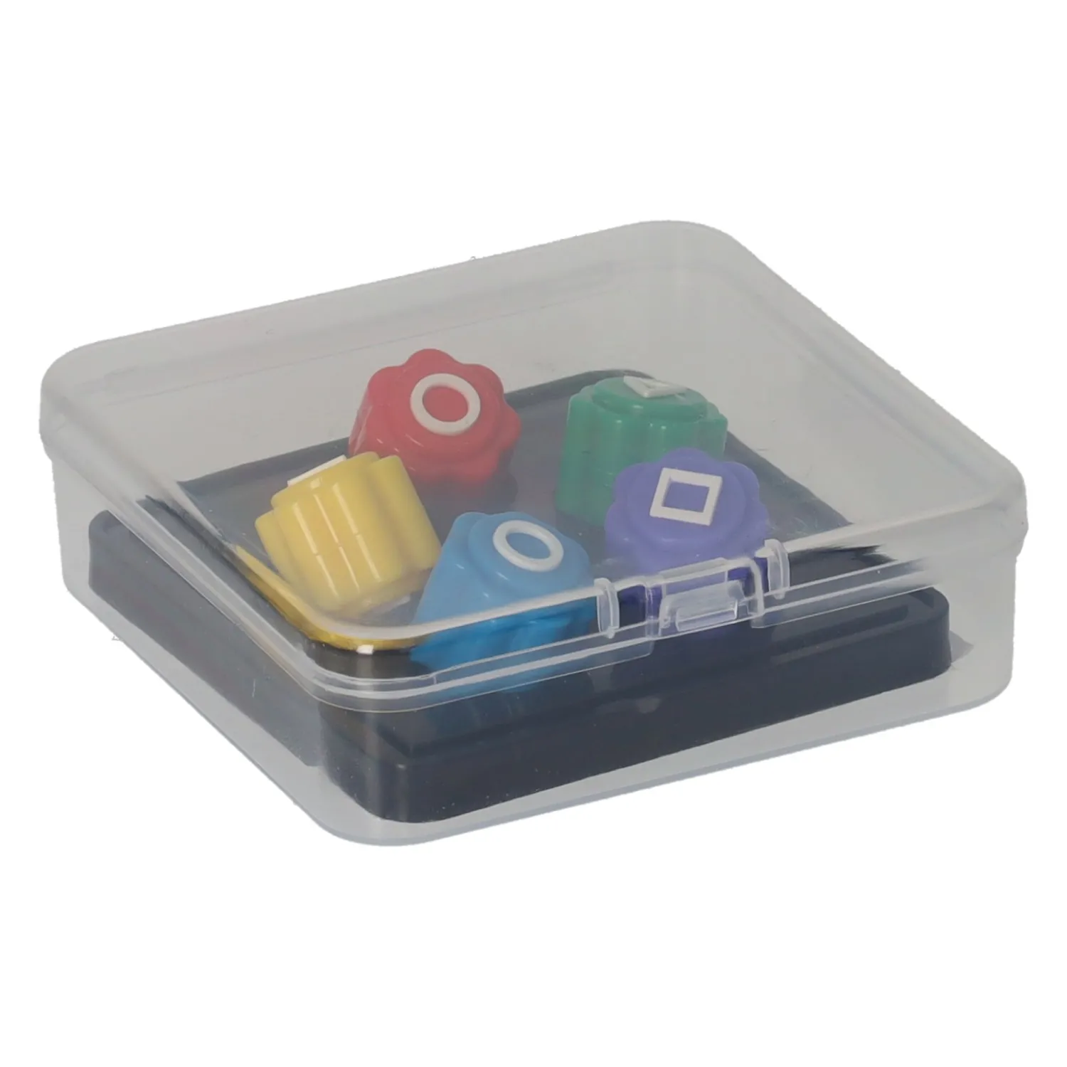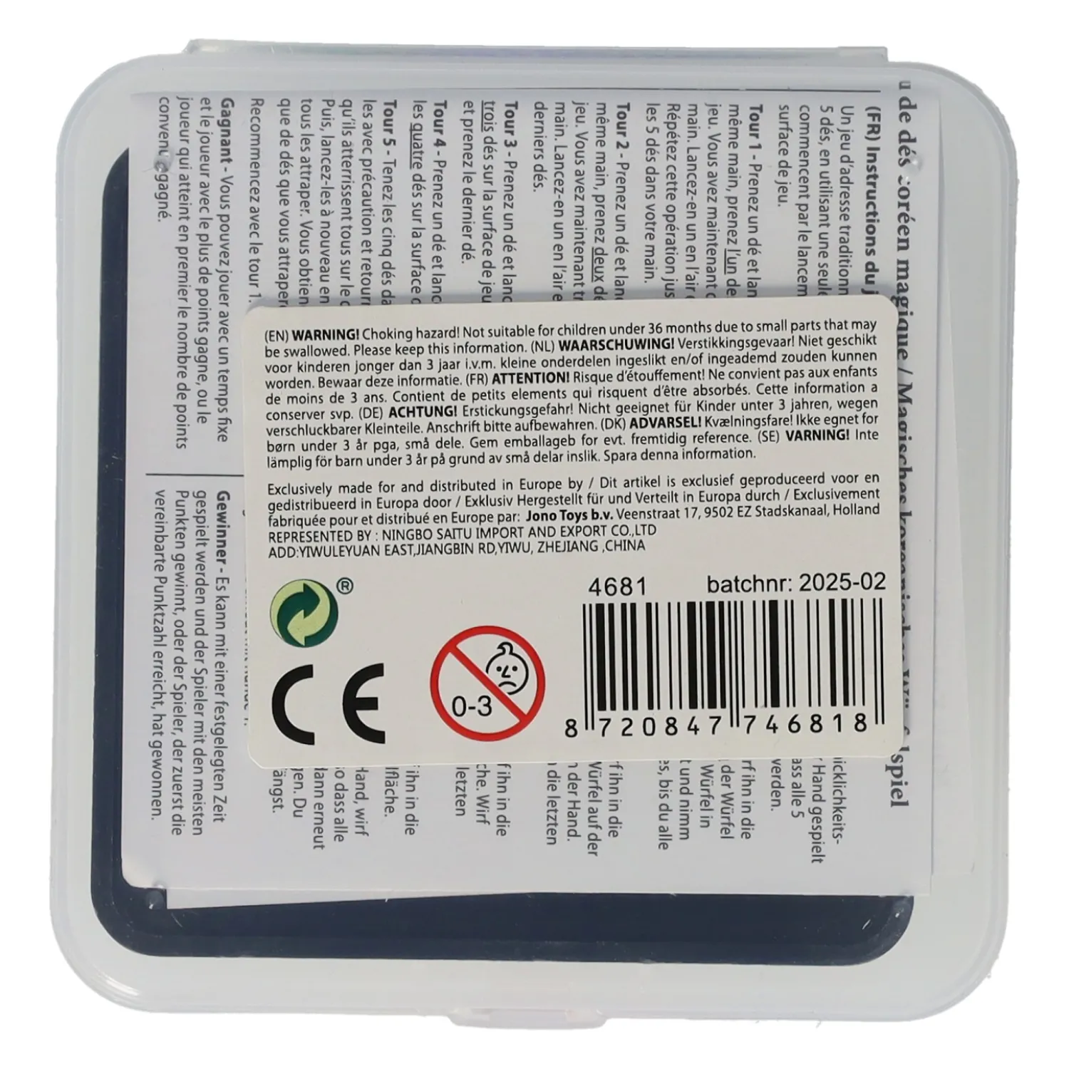 In deze set zitten 5 kunststof dobbelstenen om dit spel mee te spelen, met de bekende symbolen rondje, driehoek en vierkant. Een instructieboekje is inbegrepen in het handige opbergdoosje.