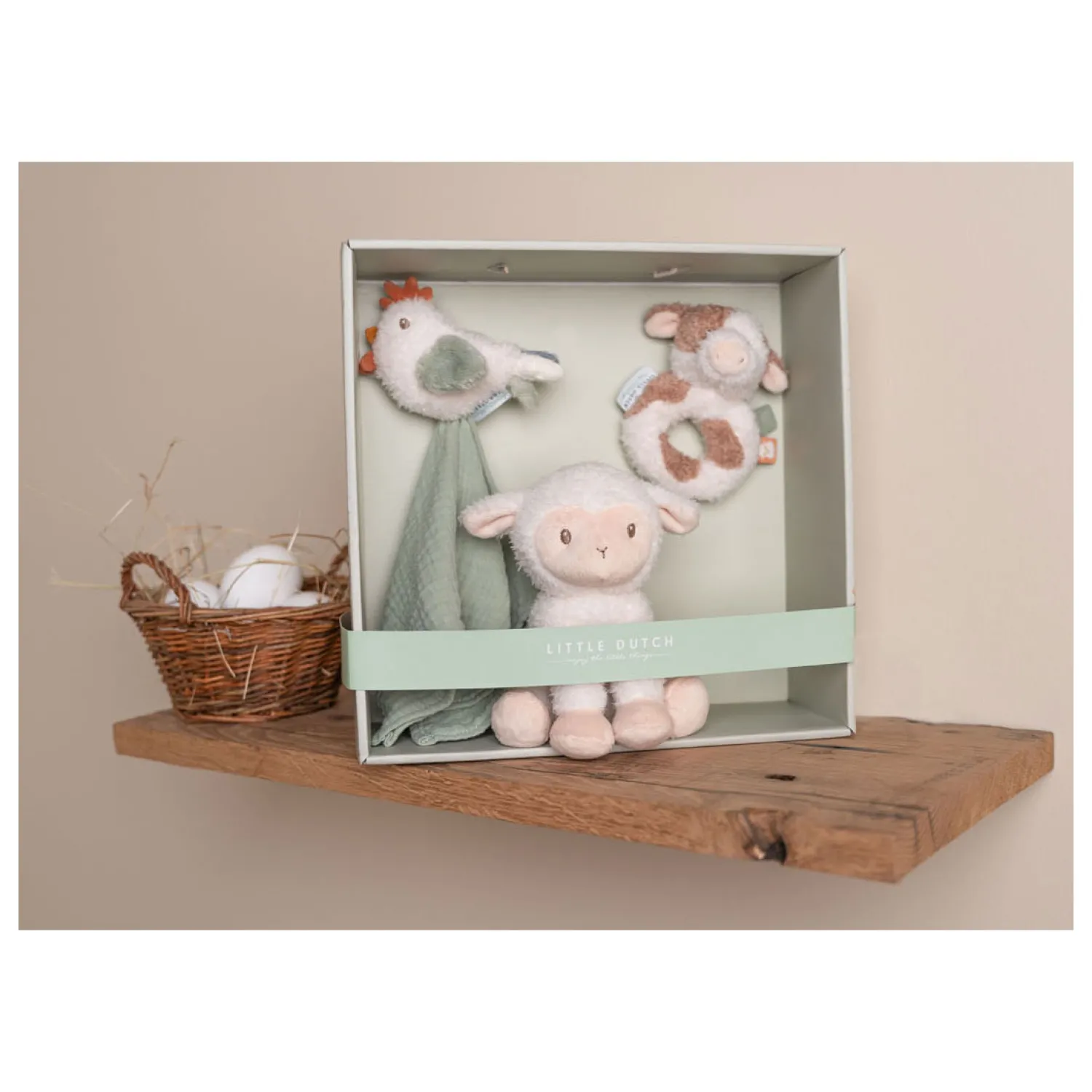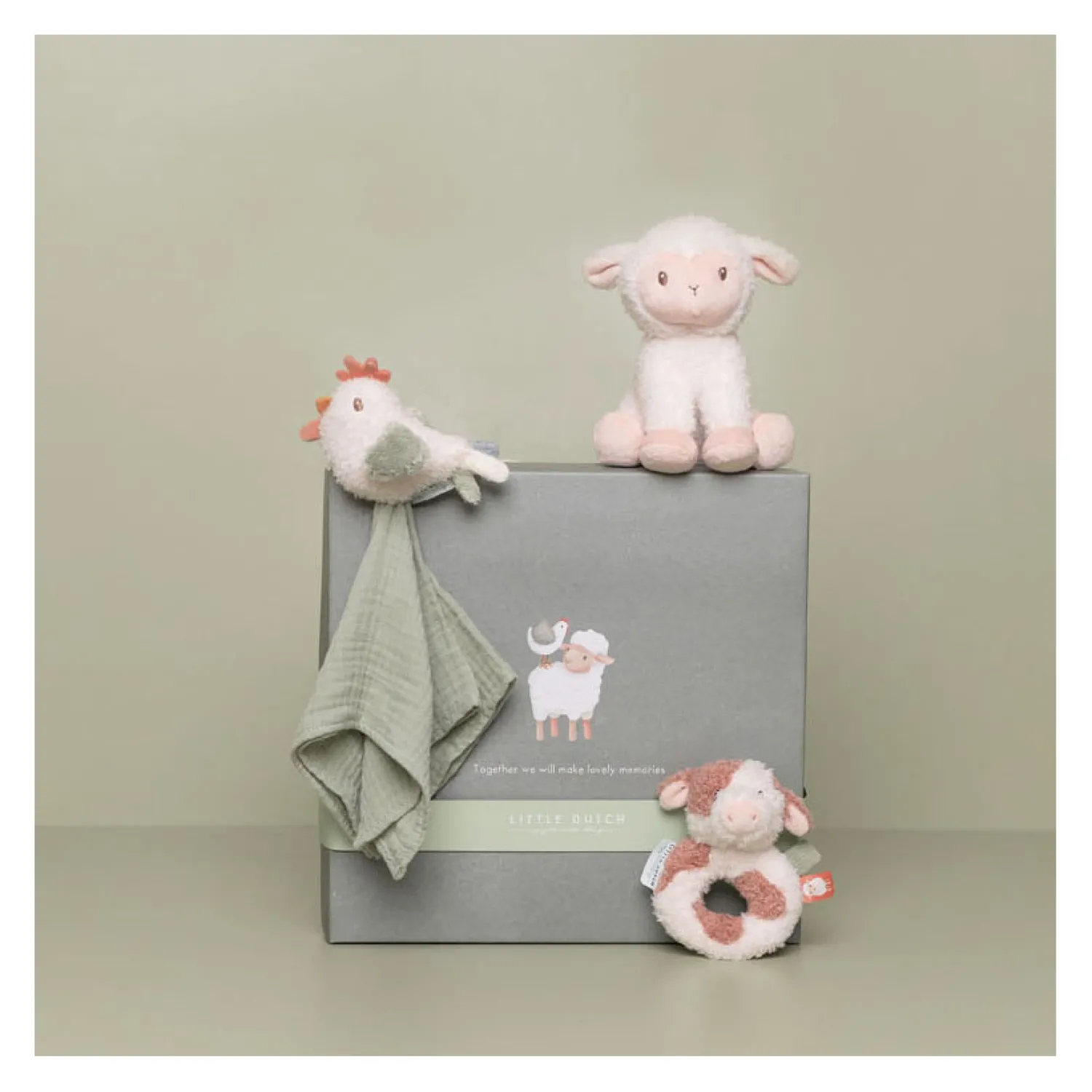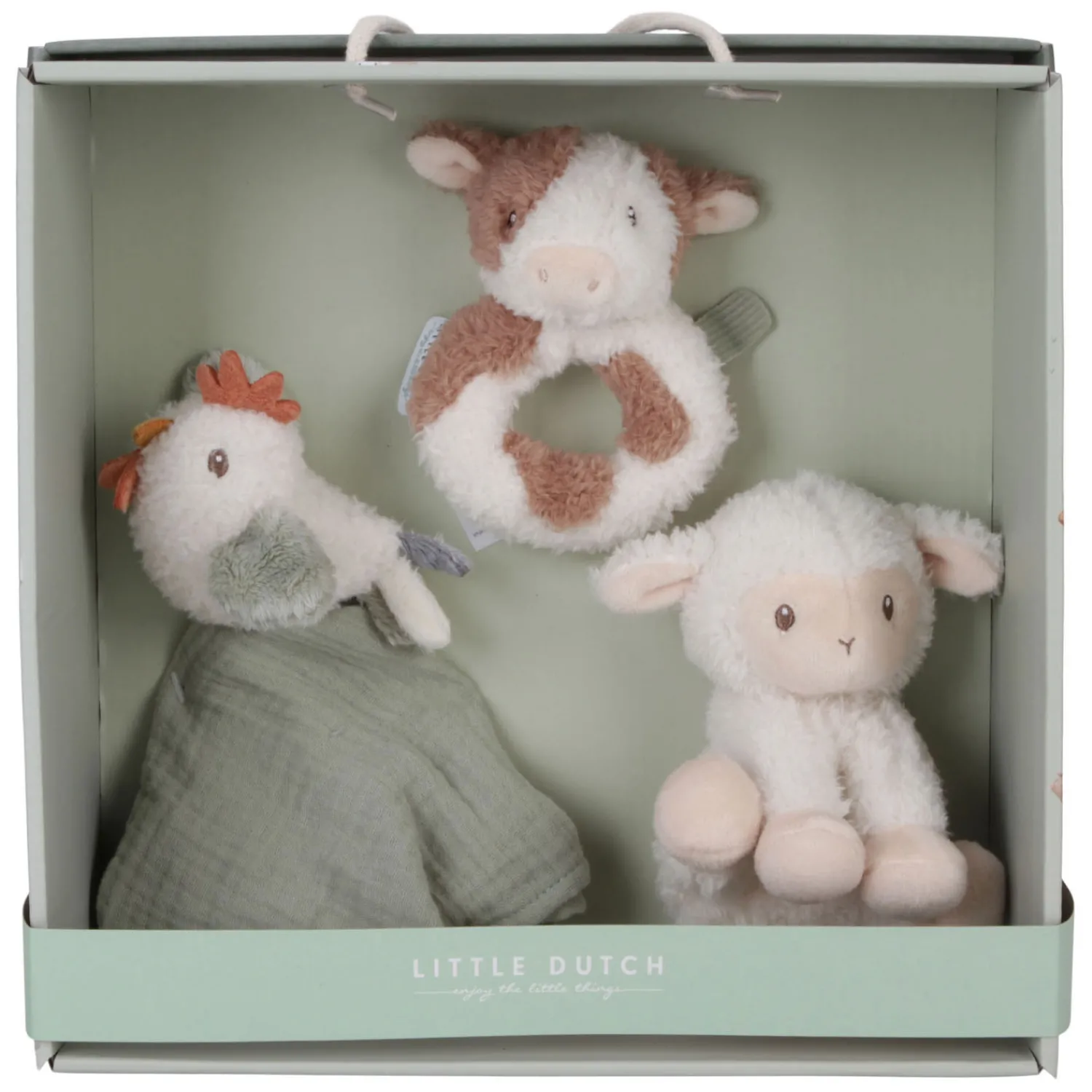 Onze favorieten uit de Little Farm collectie vormen samen een perfect kraamcadeau of babyshower geschenk. Deze mooie doos bevat drie zachte producten om mee te slapen, knuffelen en spelen. Het knuffeldoekje met zacht kipje is heerlijk om mee te knuffelen, maar is ook leuk voor een spelletje kiekeboe. Het knuffelschaapje is altijd in voor een dikke knuffel en gaat graag overal mee naartoe. Deze set bevat ook een ringrammelaar met koe om mee te spelen. Het stimuleert de hand-oogcoördinatie en de nieuwsgierigheid van kindjes. Alle 3 de producten zijn verpakt in één mooie geschenkdoos.