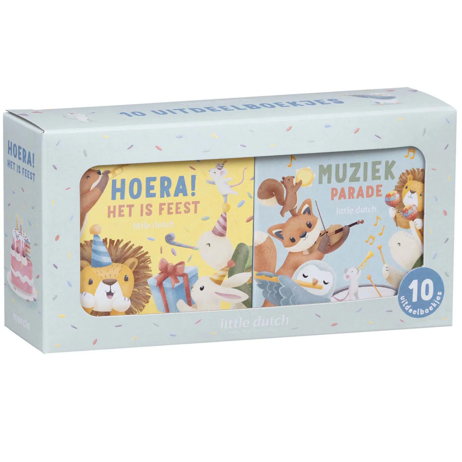 Met de uitdeelboekjes van Little Dutch maak je elk feestje nóg leuker. Deze set van 10 kleine boekjes bevat twee vrolijke titels: Hoera! Het is feest! en Muziekparade. Perfect voor kleine kinderhandjes en ideaal om uit te delen op verjaardagen, op school of als bedankje na een gezellige speelafspraak.