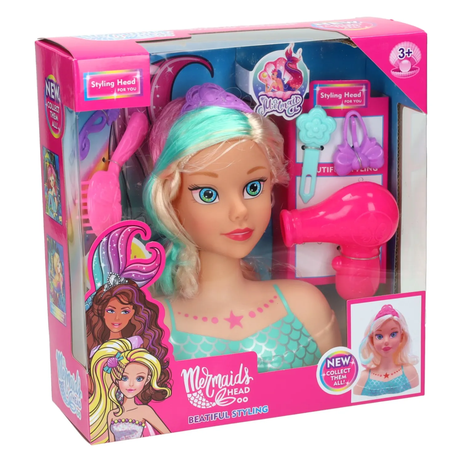 Deze kappop heeft een glanzend zeemeerminnentopje aan en kleurrijk haar met roze en paarse of turquoise plukken. Het kaphoofd wordt geleverd met leuke accessoires, zoals een speelgoedföhn, een haarborstel en haarknipjes (er zijn twee varianten van deze kappop, beide varianten hebben andere accessoires).