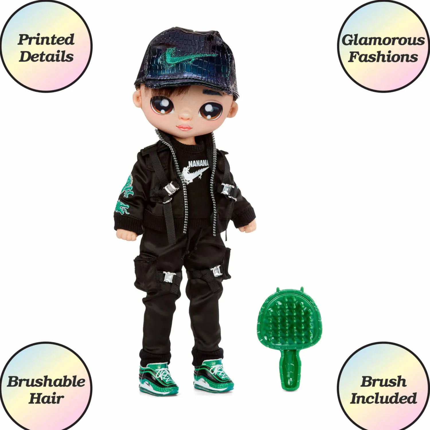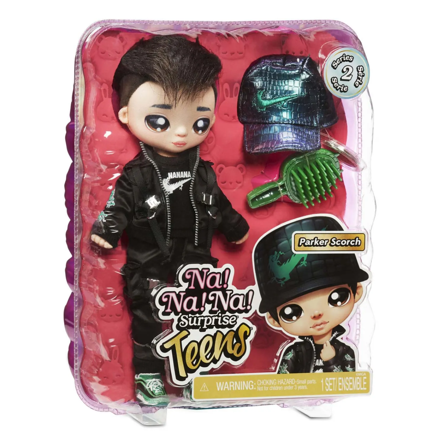 Na Na Na Surprise Teens zijn prachtige, zachte modepoppen van 28 cm met heel veel persoonlijkheid en een glamourstijl. Parker Scorch heeft zich voor zijn look laten inspireren door een draak. Hij heeft cool, zwart haar, een geprint gezichtje en geprinte kledingdetails. Hij is verpakt in een nieuwe doos met raampje, zodat je zijn hoogwaardige details goed kunt zien. Hij draagt een zwarte pet, streetwear-mode en coole gympen. Het perfecte cadeau! Er zit ook een label bij met zijn naam, verjaardag en een verhaaltje over hem erop. Verzamel alle 5 de supermooie, zachte Teens-modepoppen.