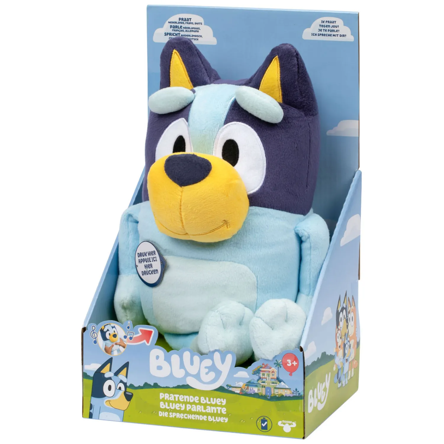 De knuffel is 33 cm groot en geschikt voor kinderen vanaf 3 jaar. Bluey spreekt Nederlands, Frans of Duits.