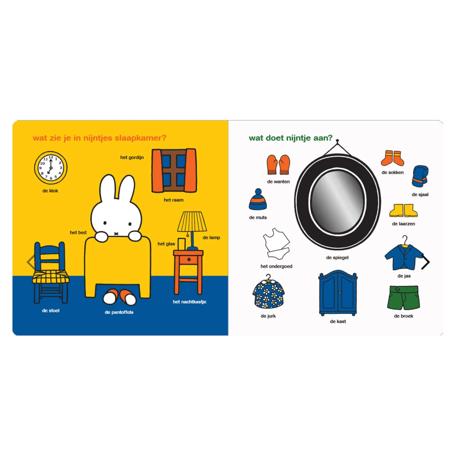 Wat zie je in nijntjes slaapkamer? Wat doet ze aan? Kijk, daar zijn alle vriendjes van nijntje. Ken jij ze allemaal? Stimuleer de zintuigen met dit lekker stevige, grote voelboek. Kijk naar de plaatjes, voel de verschillende stofjes en vertel wat je ziet. Leer samen met nijntje nieuwe woordjes. De lidwoorden staan ook bij de woordjes.
