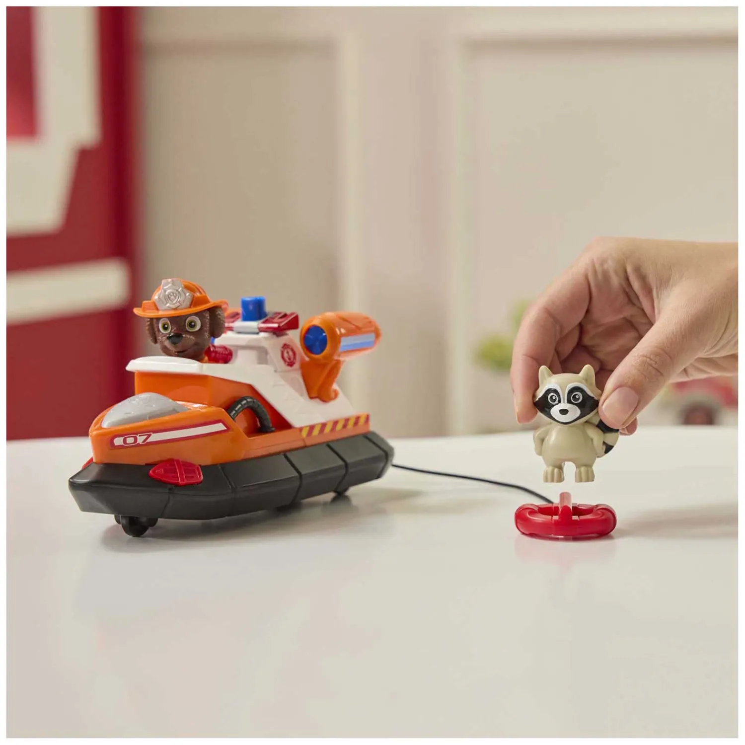 De brandweerboot is uitgerust met een werpbare reddingsboei aan een touwtje – ideaal voor actievolle missies! Druk op de knop om de boei af te vuren en laat het wasbeertje, dat perfect op de boei past, veilig gered worden door Zuma. De set bevat ook een schattig wasbeerfiguurtje voor extra speelplezier.