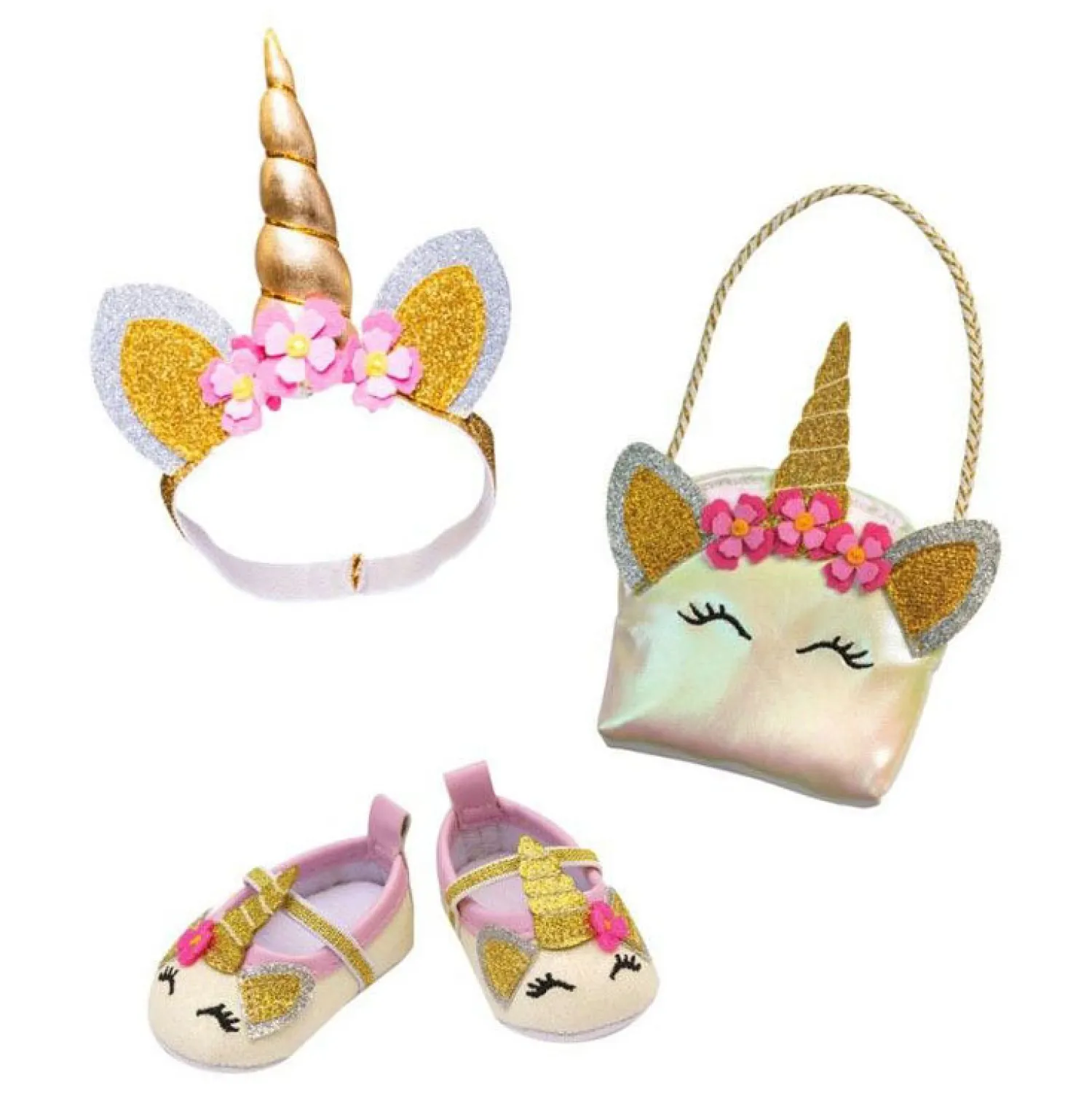 De poppenaccessoireset “Glitter Unicorn” past perfect bij het glitterjurkje “Goldy Unicorn” (art.nr. 2231), maar kan ook gecombineerd worden met vele andere poppenkleding uit de Heless collectie.