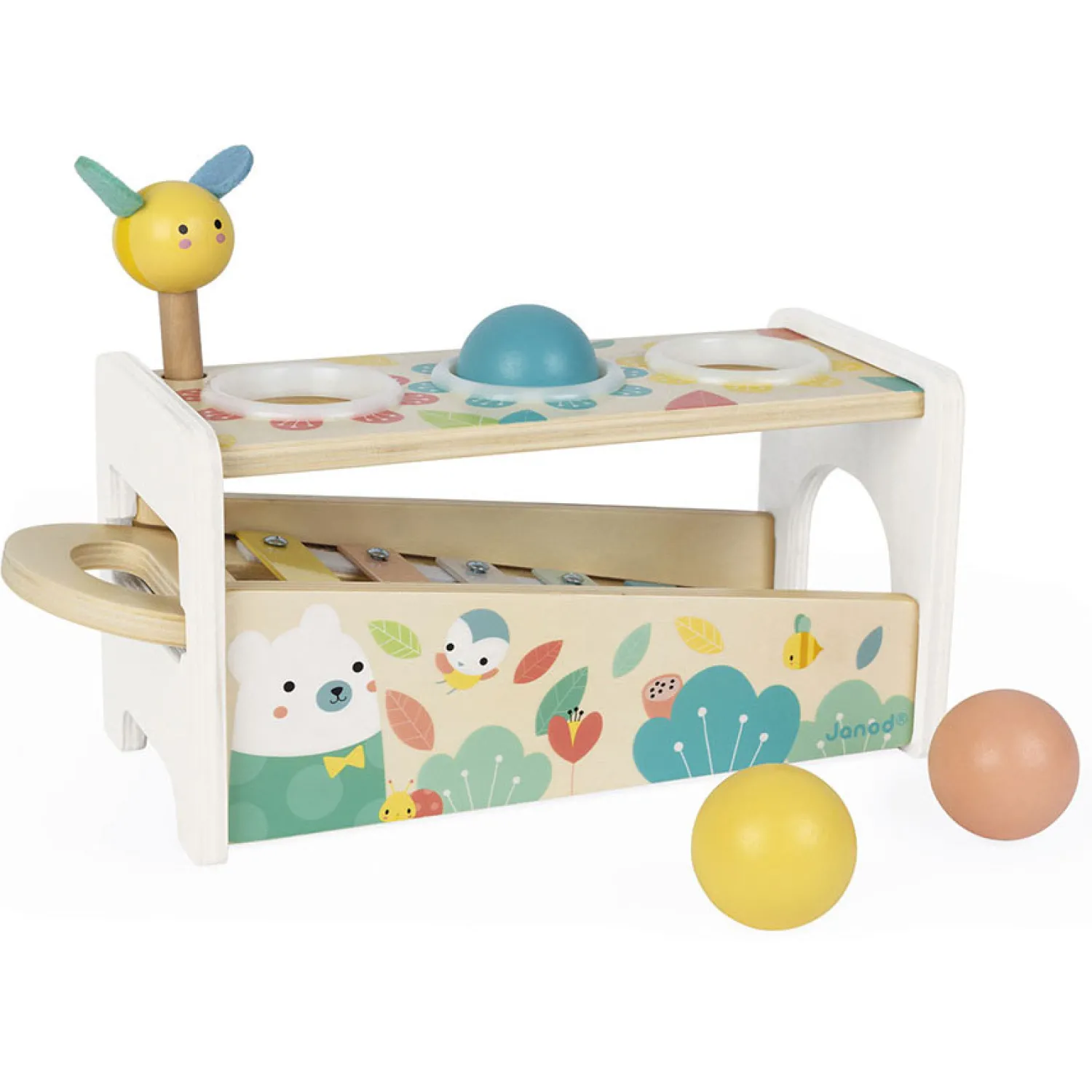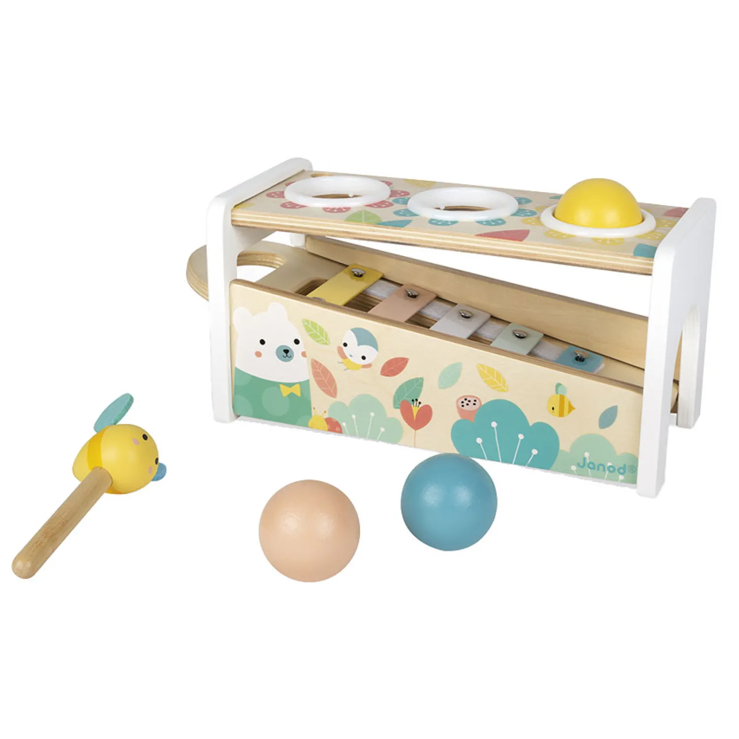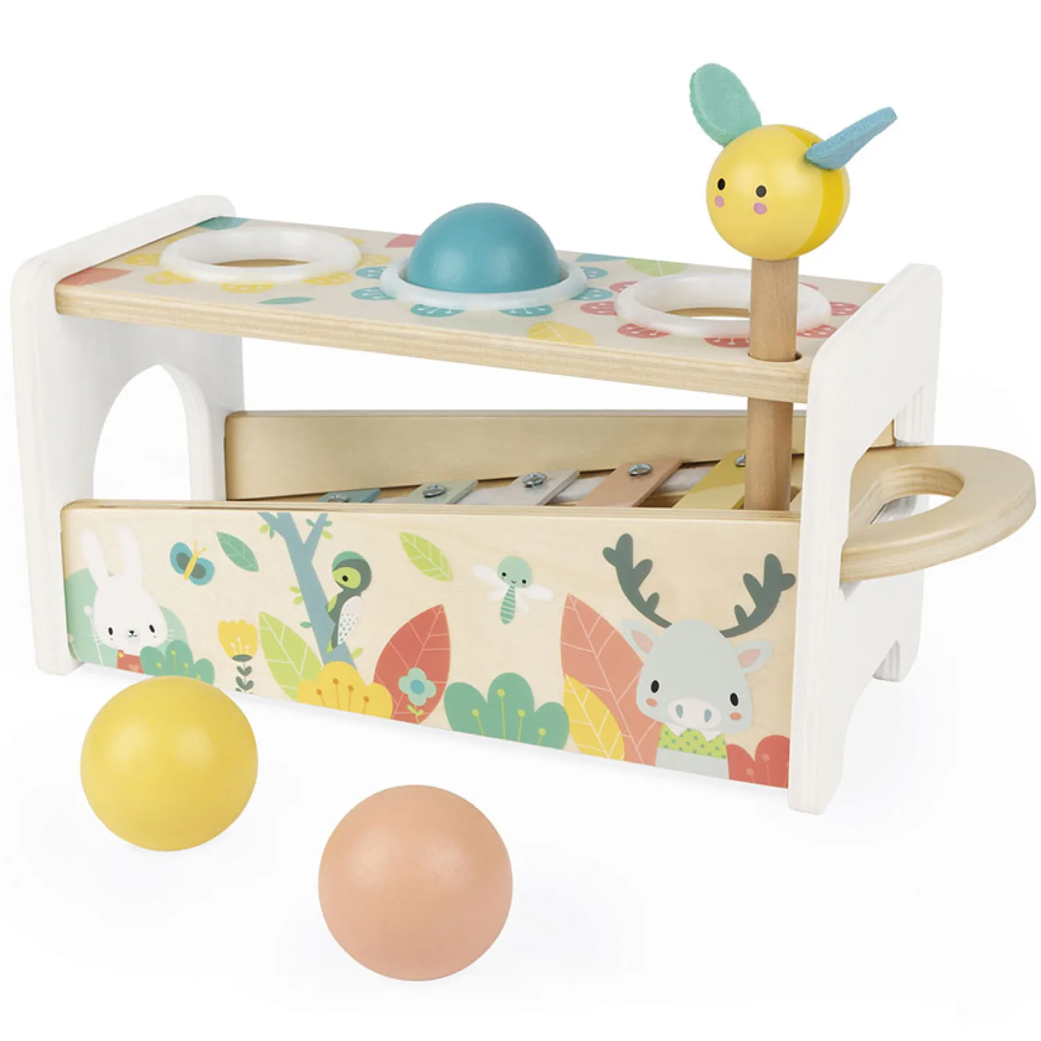 2 spelletjes in 1: een bijenhamer om op de 3 vallende ballen te slaan en de toetsen van de xylofoon doen klinken en een uitneembare xylofoon om overal te kunnen spelen!
