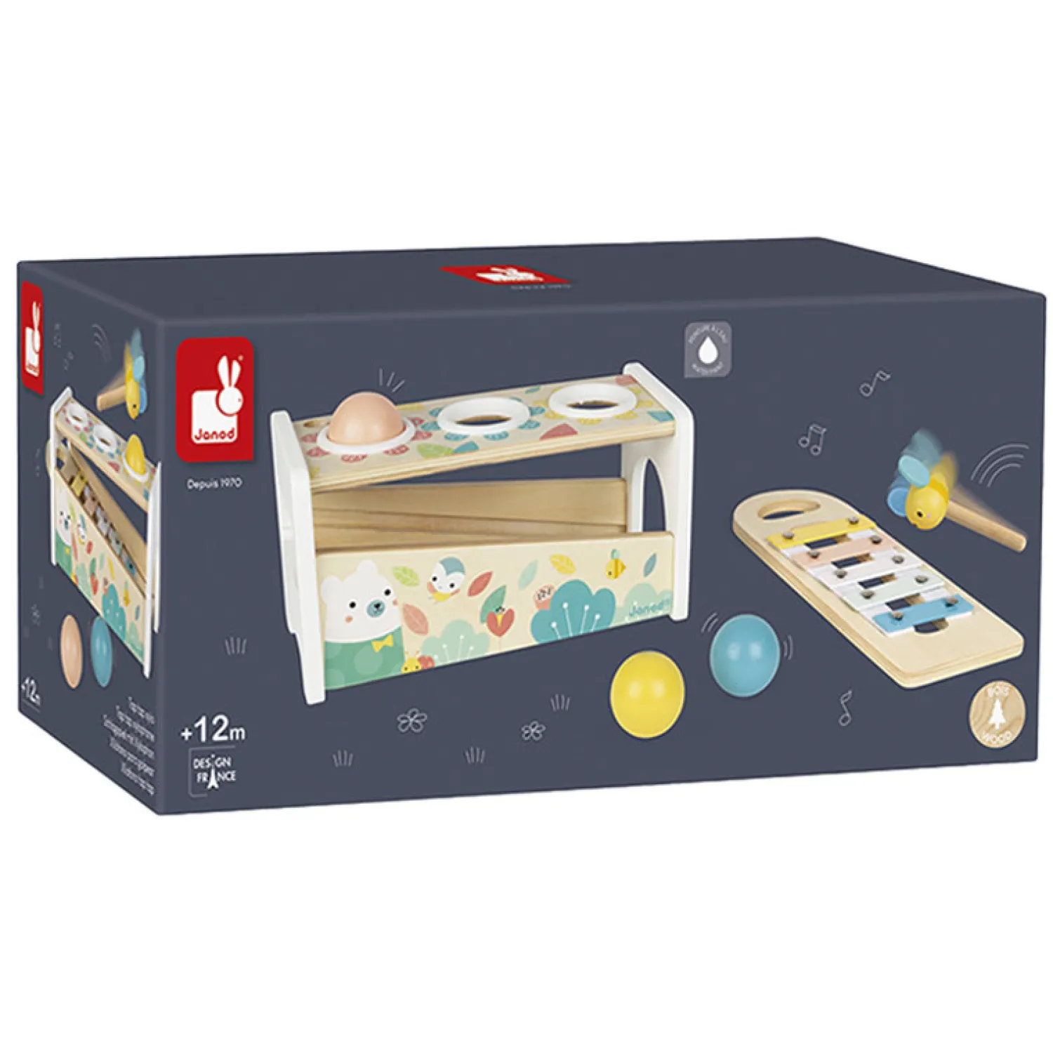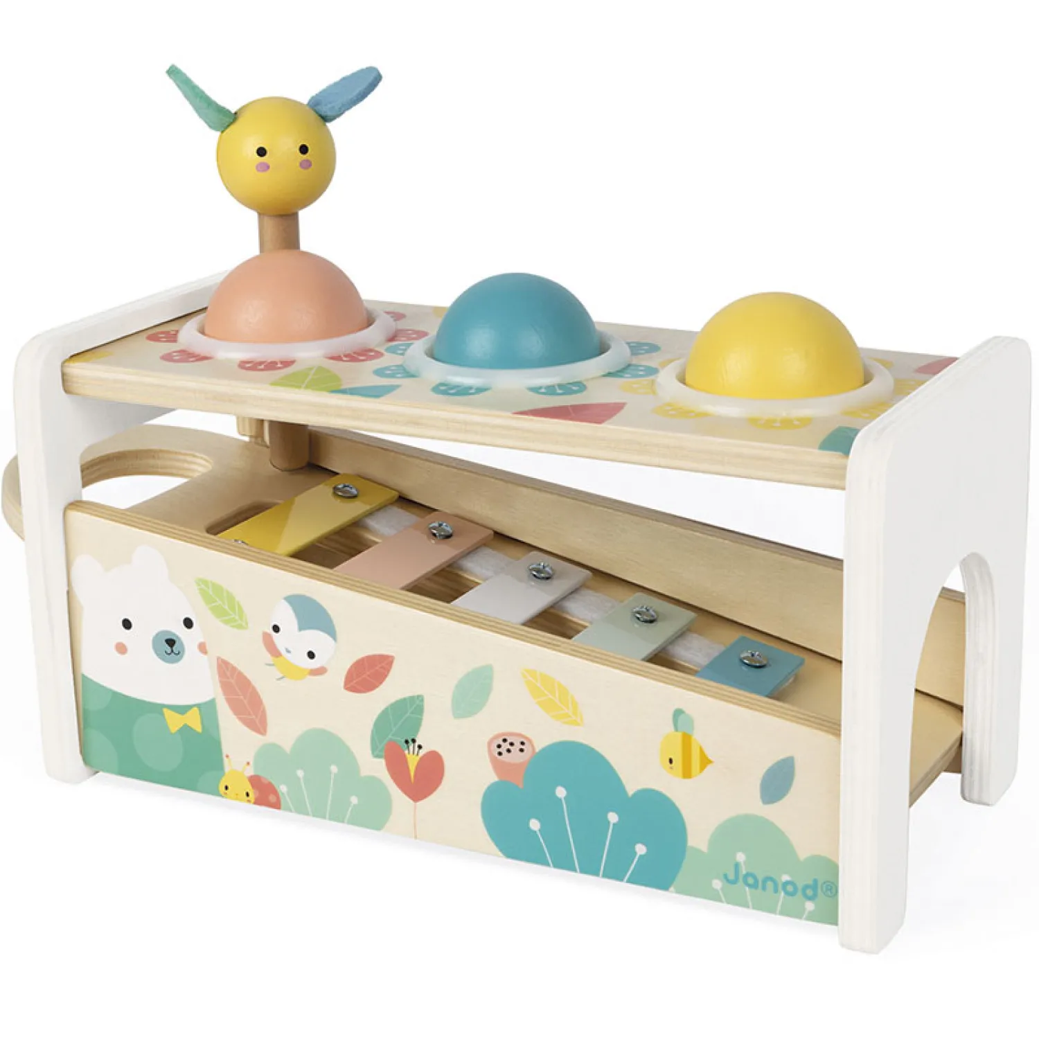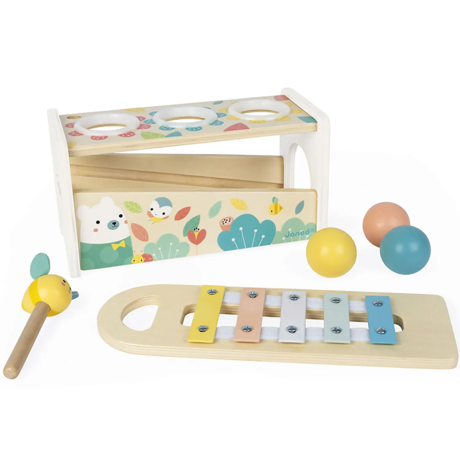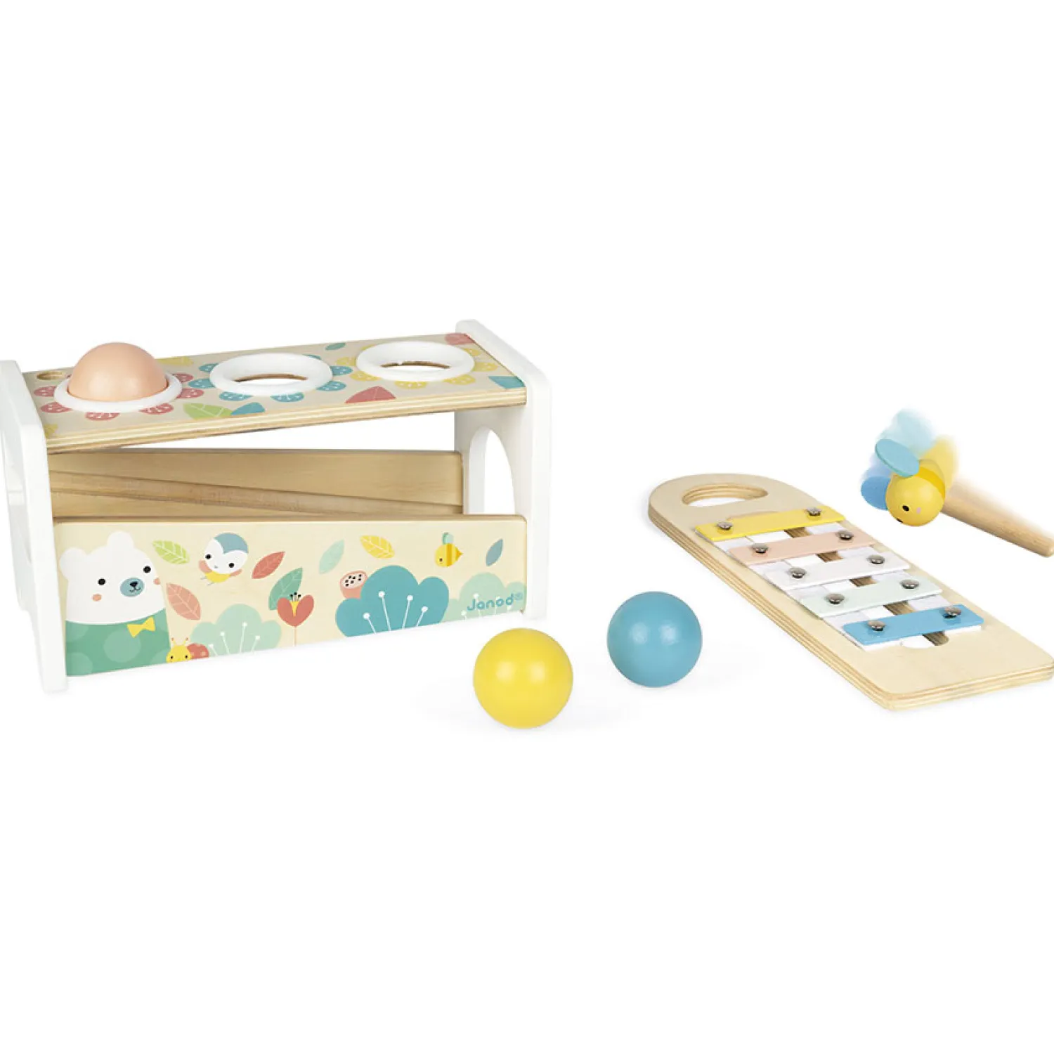 2 spelletjes in 1: een bijenhamer om op de 3 vallende ballen te slaan en de toetsen van de xylofoon doen klinken en een uitneembare xylofoon om overal te kunnen spelen!