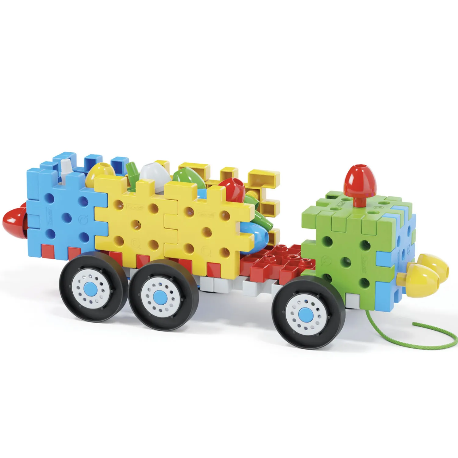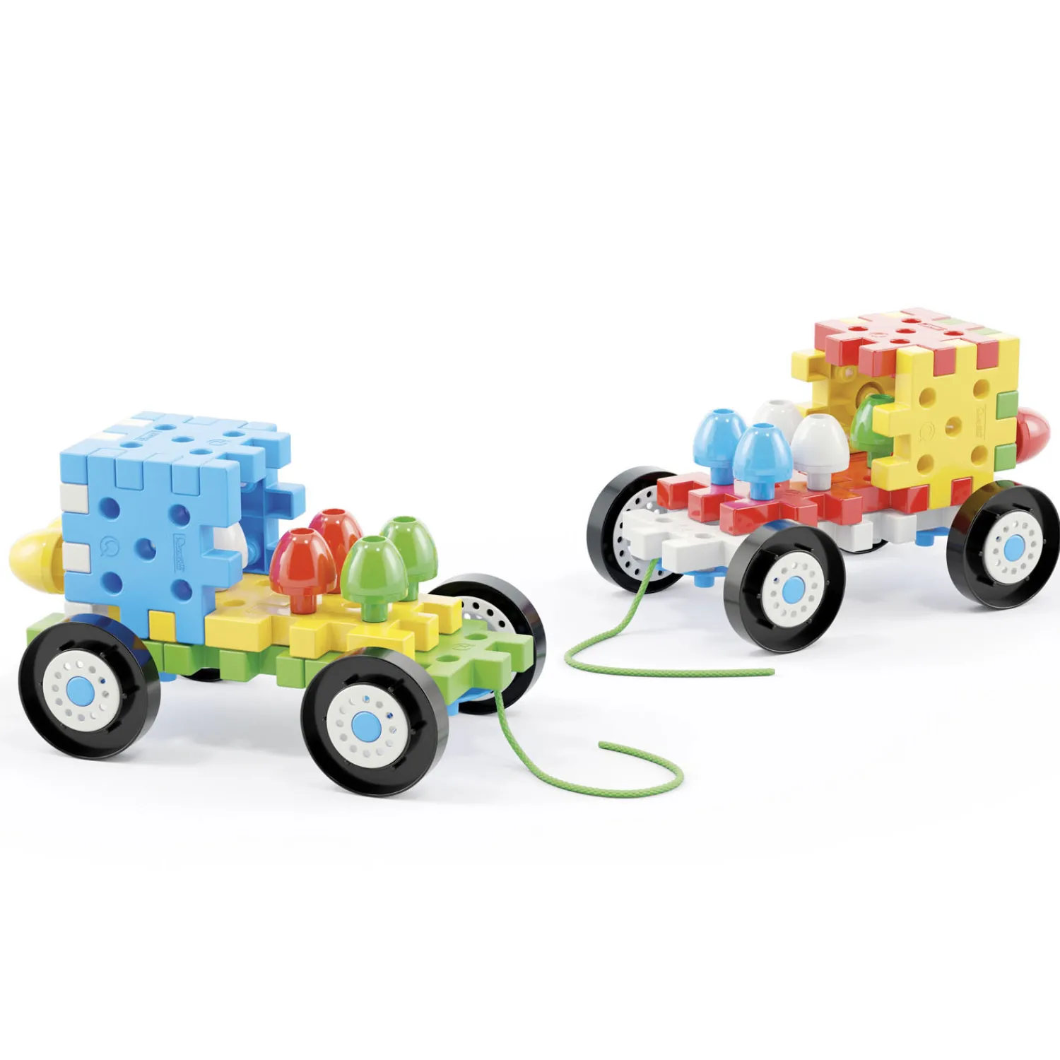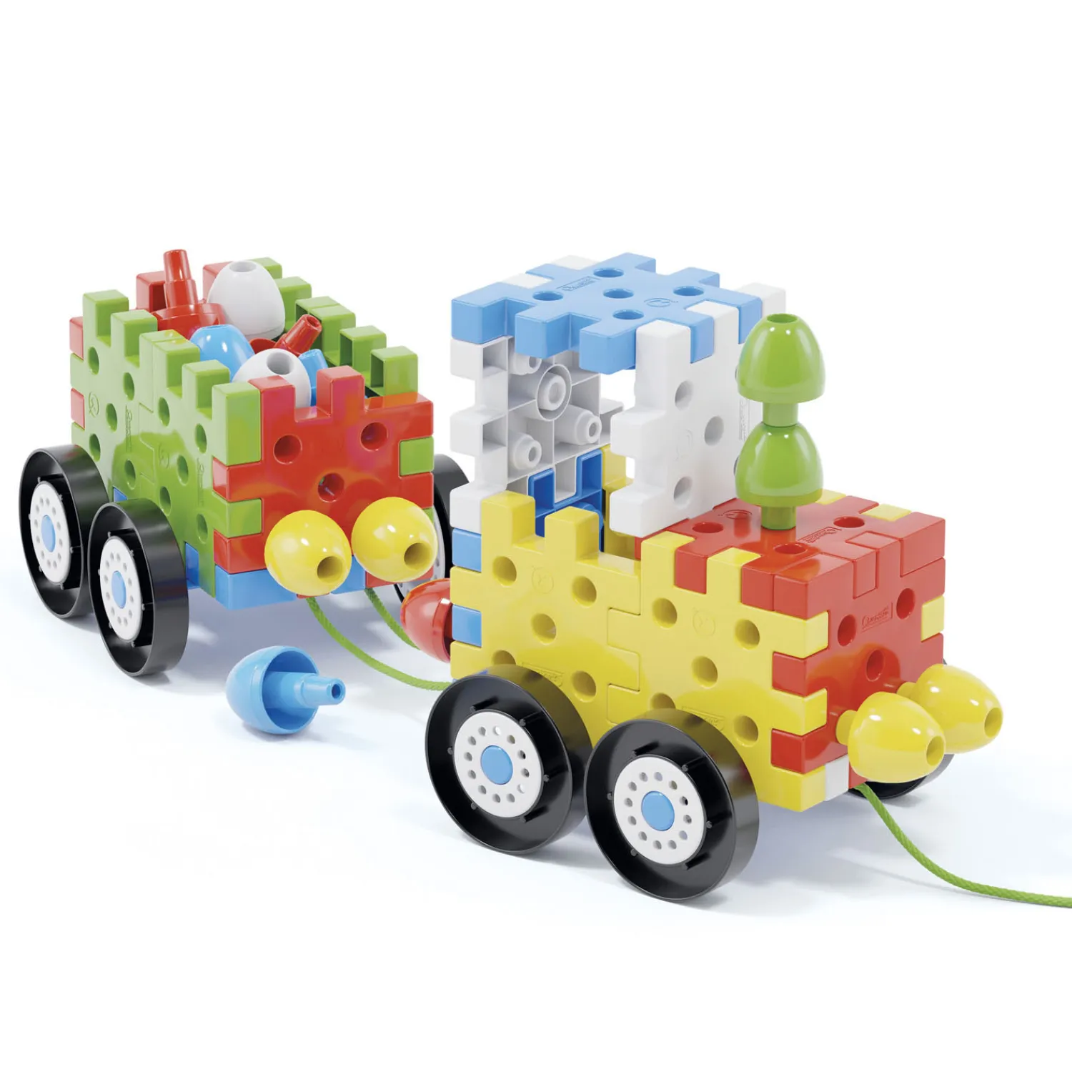 en wielen. De stukjes schuiven moeiteloos in elkaar waardoor de voertuigen goed te bouwen zijn door kleine handjes. Constructiespeelgoed dat is ontworpen om de fijne motoriek en hand-oog coördinatie te stimuleren! Geschikt vanaf 2 jaar.