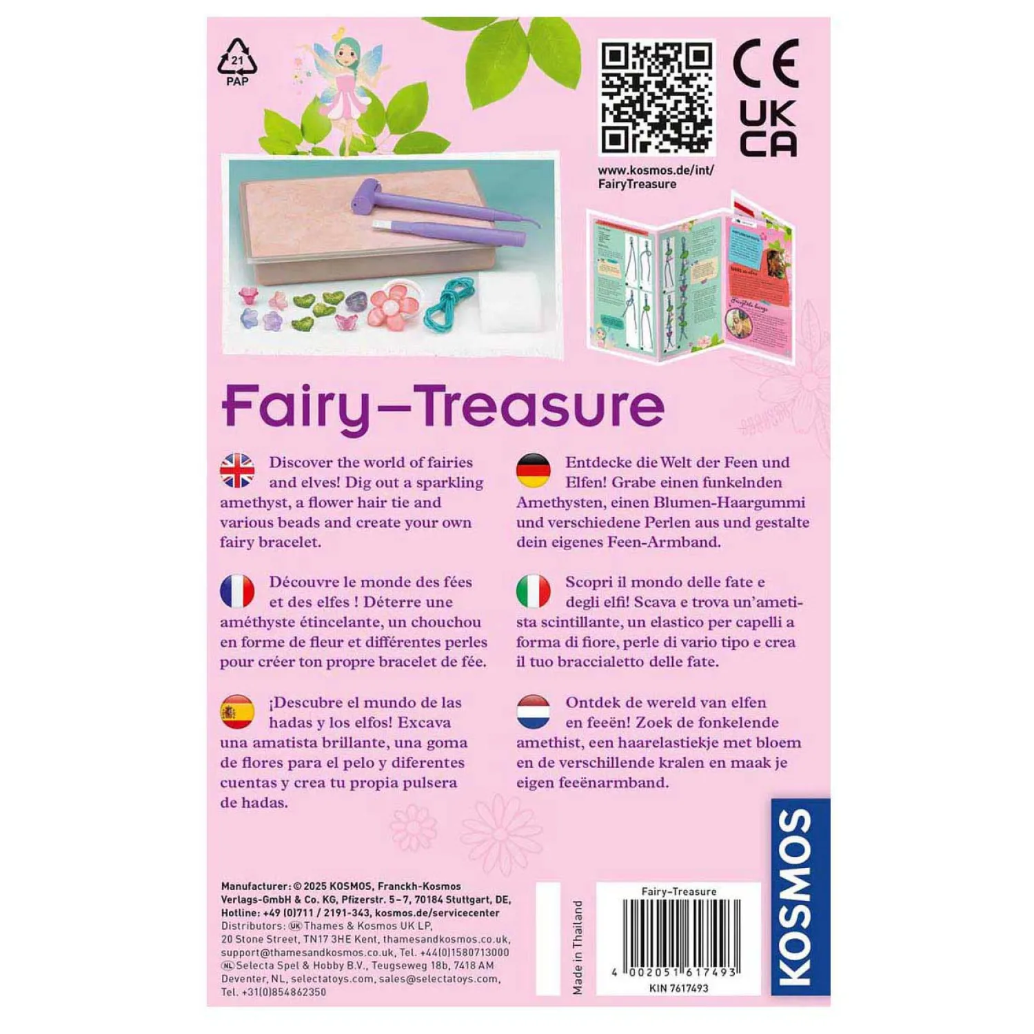 Na het uitgraven begint het creatieve deel: kinderen rijgen hun eigen feeënarmband met behulp van de stap-voor-stap handleiding. Ondertussen leren ze leuke weetjes over feeën, edelstenen en zelfs een beetje archeologie. Alles wat nodig is, zit in de doos!
