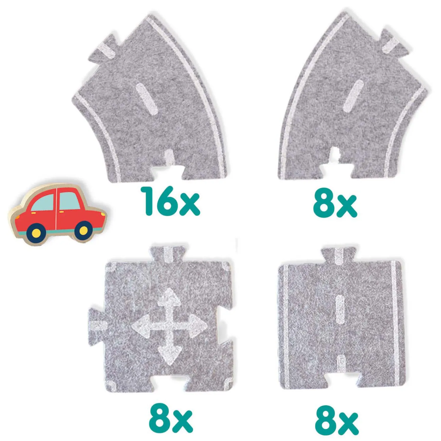 Bouw je eigen wegennet met het 40-delige Vilten wegencircuit! Met deze dikke vilten wegstukken kun je eindeloos variëren en je eigen parcours creëren. De puzzelverbindingen zijn eenvoudig aan elkaar te koppelen, wat zorgt voor urenlang speelplezier. De set bevat een leuke houten auto, maar de wegen zijn ook te gebruiken met alle kleine speelgoedauto’s van bekende merken. Bovendien is de set verder uit te breiden met extra 20-delige of 40-delige sets, waardoor nog langere wegen mogelijk zijn!Perfect voor kinderen die houden van bouwen en spelen!