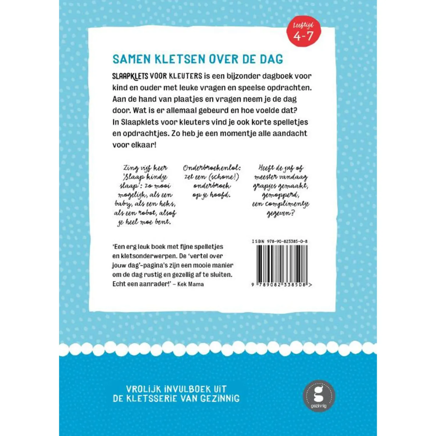 Slaapklets! voor kleuters is een dagboek voor het slapengaan. Met behulp van plaatjes en vragen kun je de dag doornemen met je kind. Wat is er allemaal gebeurd en hoe voelde dat?