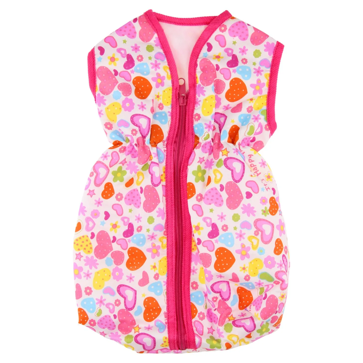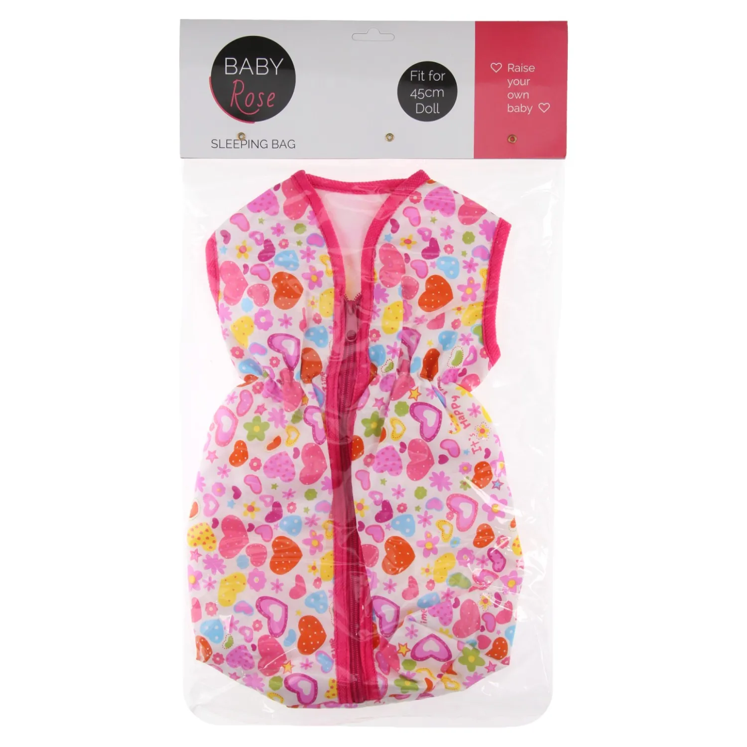 Wat zal je pop lekker slapen in deze slaapzak van Baby Rose. De slaapzak is voorzien van een roze rits en heeft een kleurrijk patroon van hartjes en bloemen. De slaapzak is geschikt voor poppen met een lengte tot en met 45 cm en is brandvertragend.