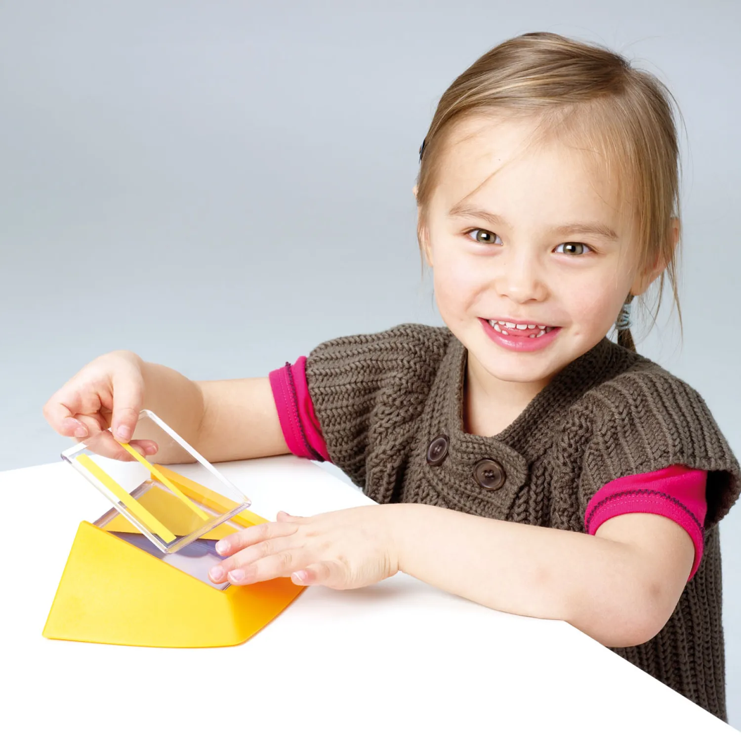 Inhoud: 18 doorzichtige plaatjes met vrolijk gekleurde vormen, handige houder, boekje met opdrachten en oplossingen.