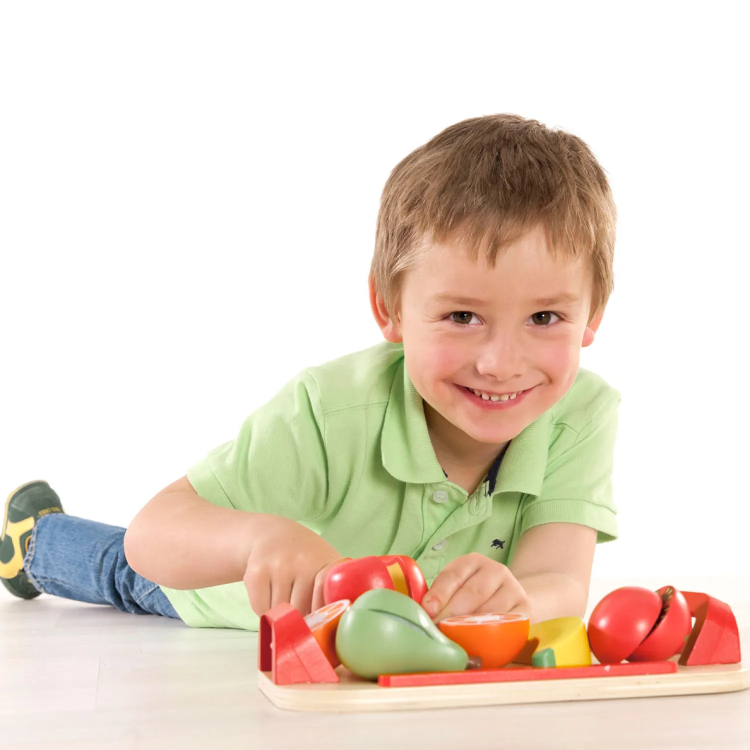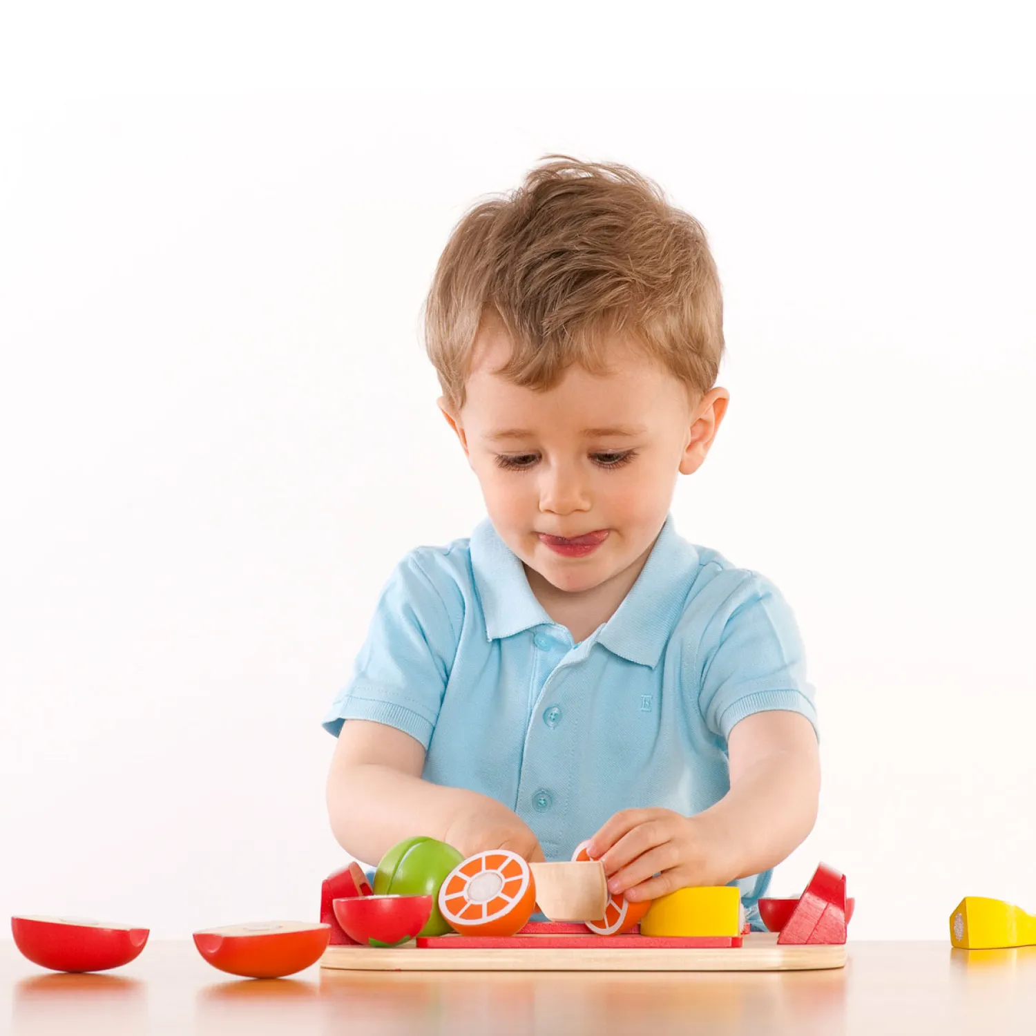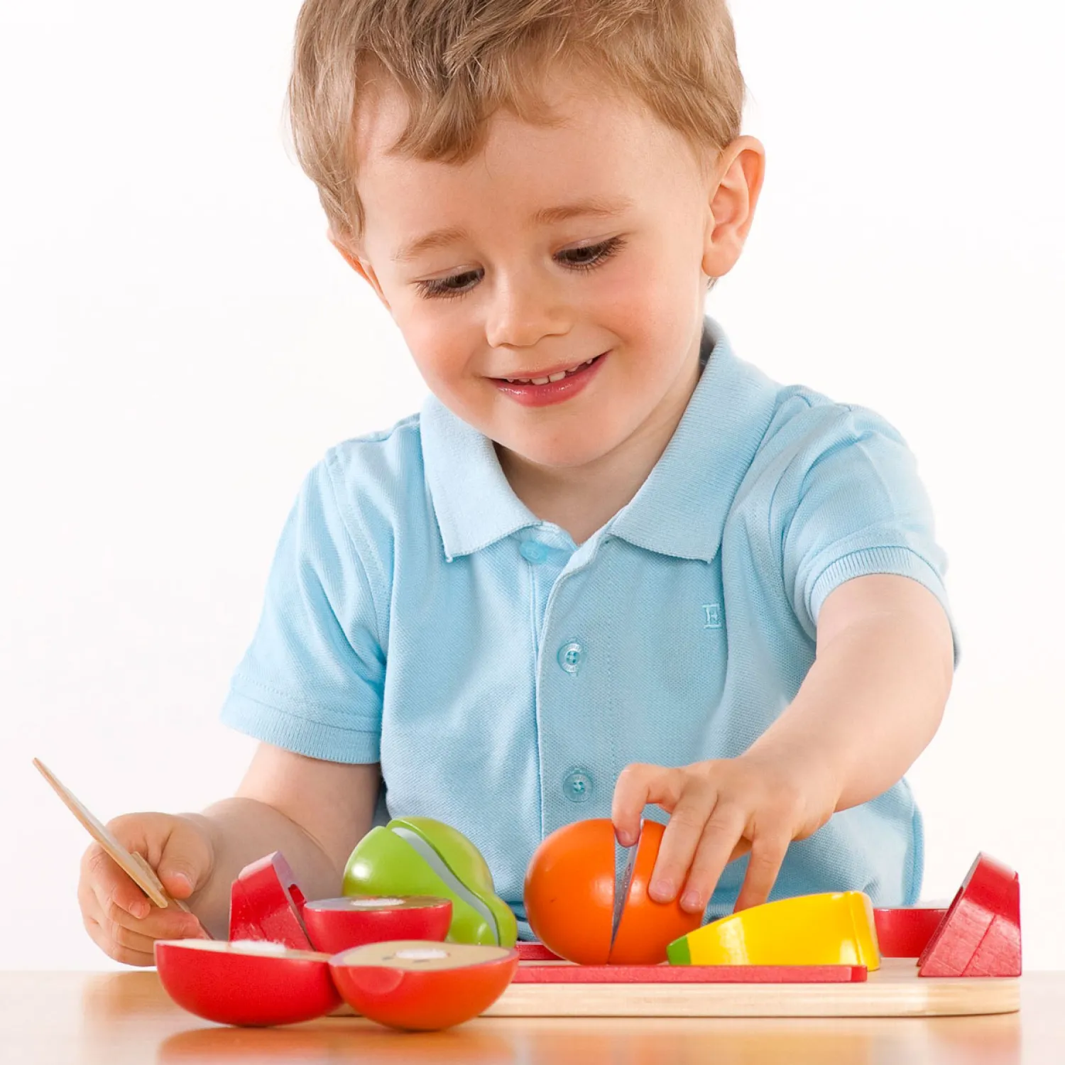 Maak de lekkerste fruitsalade klaar. Met deze Eichhorn snijplank met fruit kun je alvast oefenen voor het echte werk. Je hebt een appel, peer, banaan, kiwi en een sinaasappel. Leg het fruit op de snijplank en snij ze doormidden met het houten mes. Met het klittenband kun je het fruit weer gemakkelijk aan elkaar maken. Inhoud: 2 halve kiwi’s, 2 halve bananen, 2 halve peren, 2 halve appels, 2 halve sinaasappels, 1 mes, 1 dienblad/snijplank.