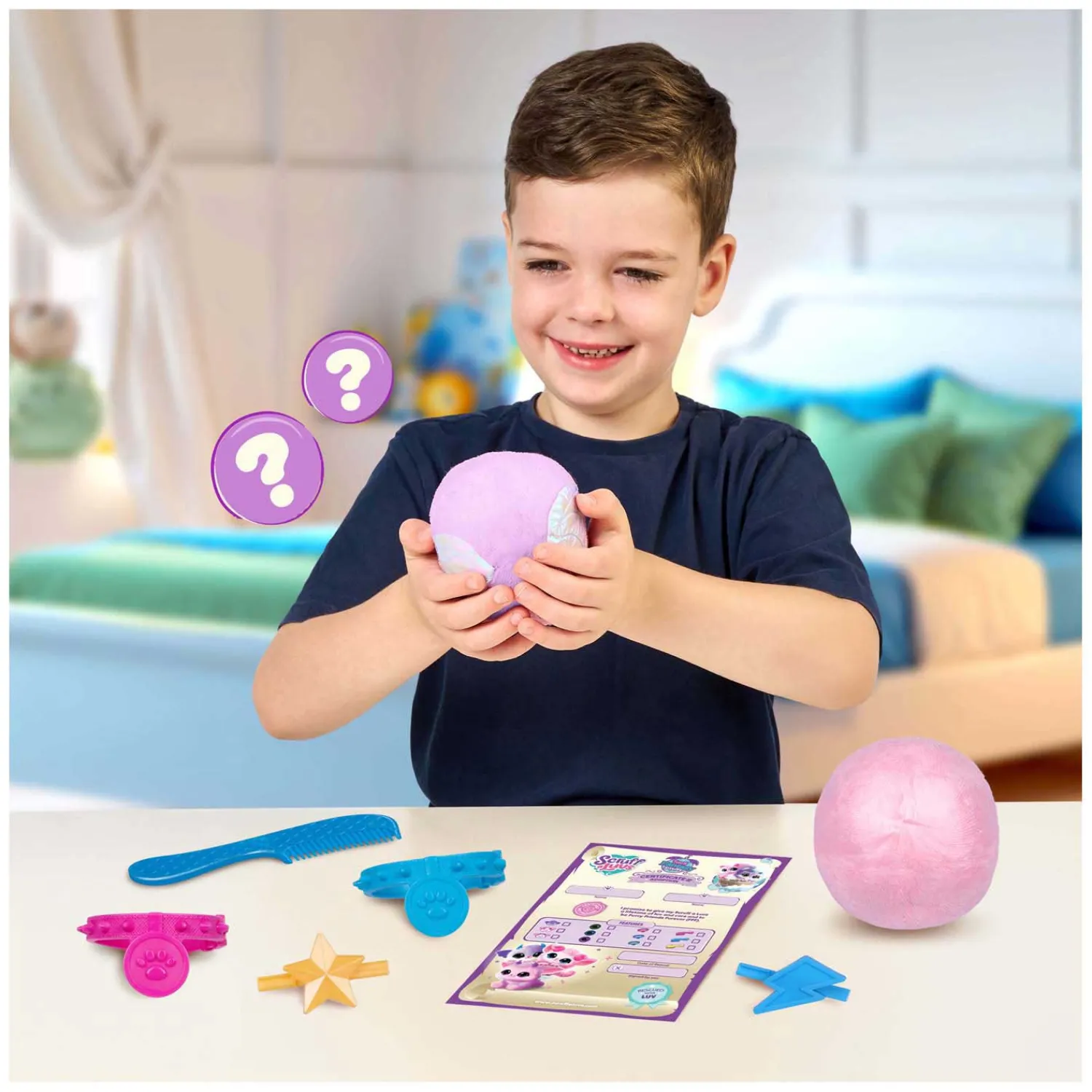 Na het wassen en afdrogen is jouw Scruff a Luv nog niet zo zacht, daarvoor moet je haar eerst goed verwennen met een warme föhn (niet meegeleverd), zodat haar vacht superglanzend en zacht wordt. Gebruik de kam, halsband en haarclip om je knuffel helemaal naar wens te stylen. Elk diertje is uniek en de accessoires kunnen per verrassing verschillen. Leeftijdsindicatie: 2 jaar+