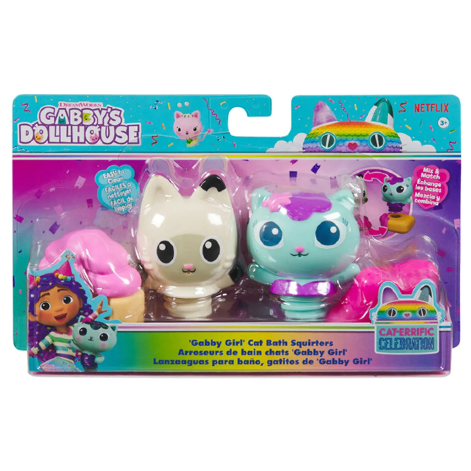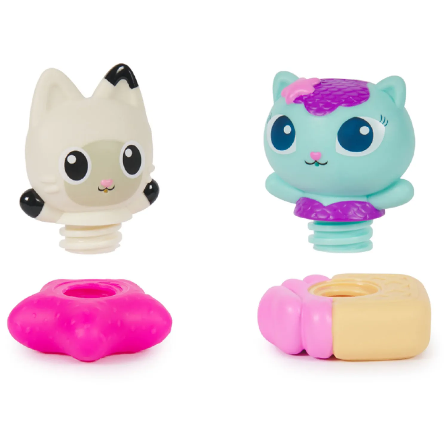 Inhoud: 1 Meerminkat-waterspuiter, 1 Pandy Poek-waterspuiter, 2 zwembanden