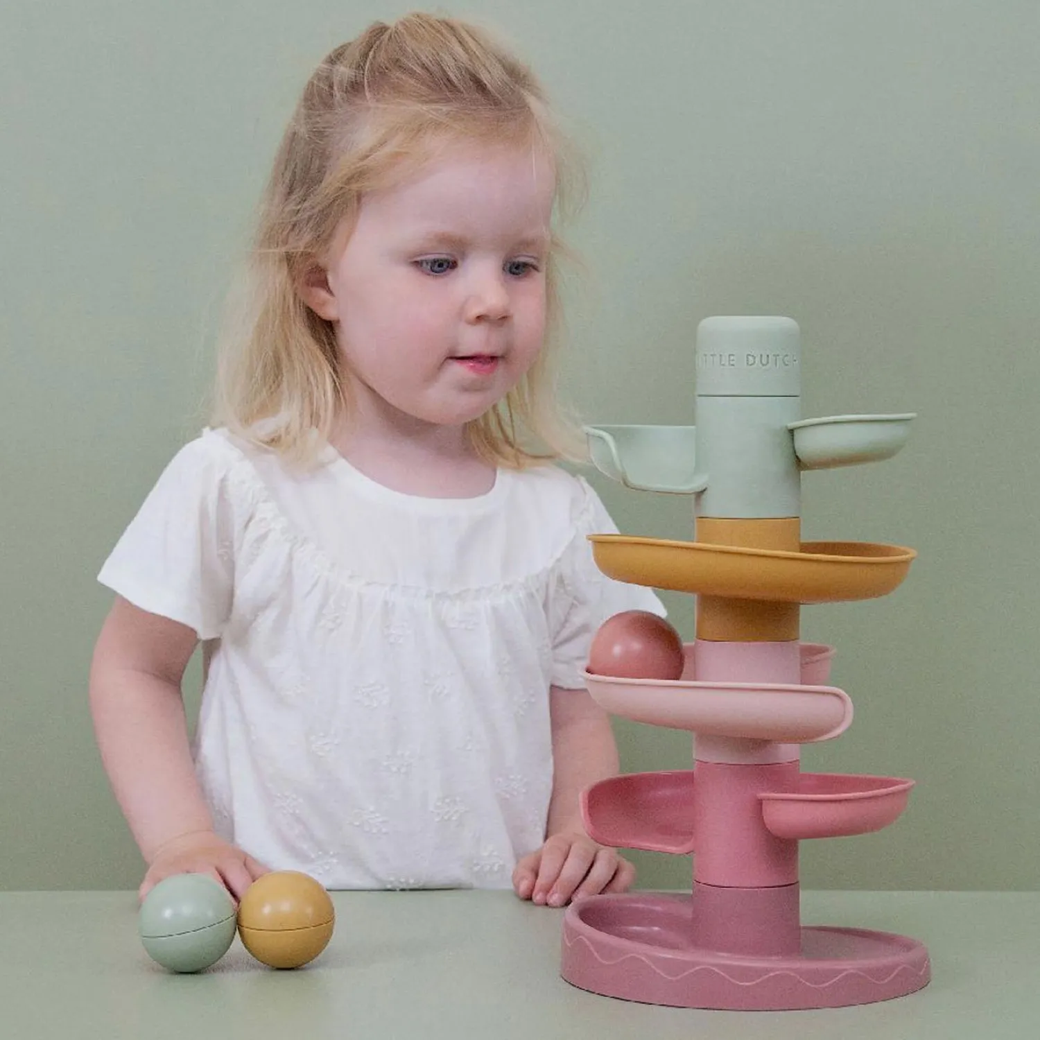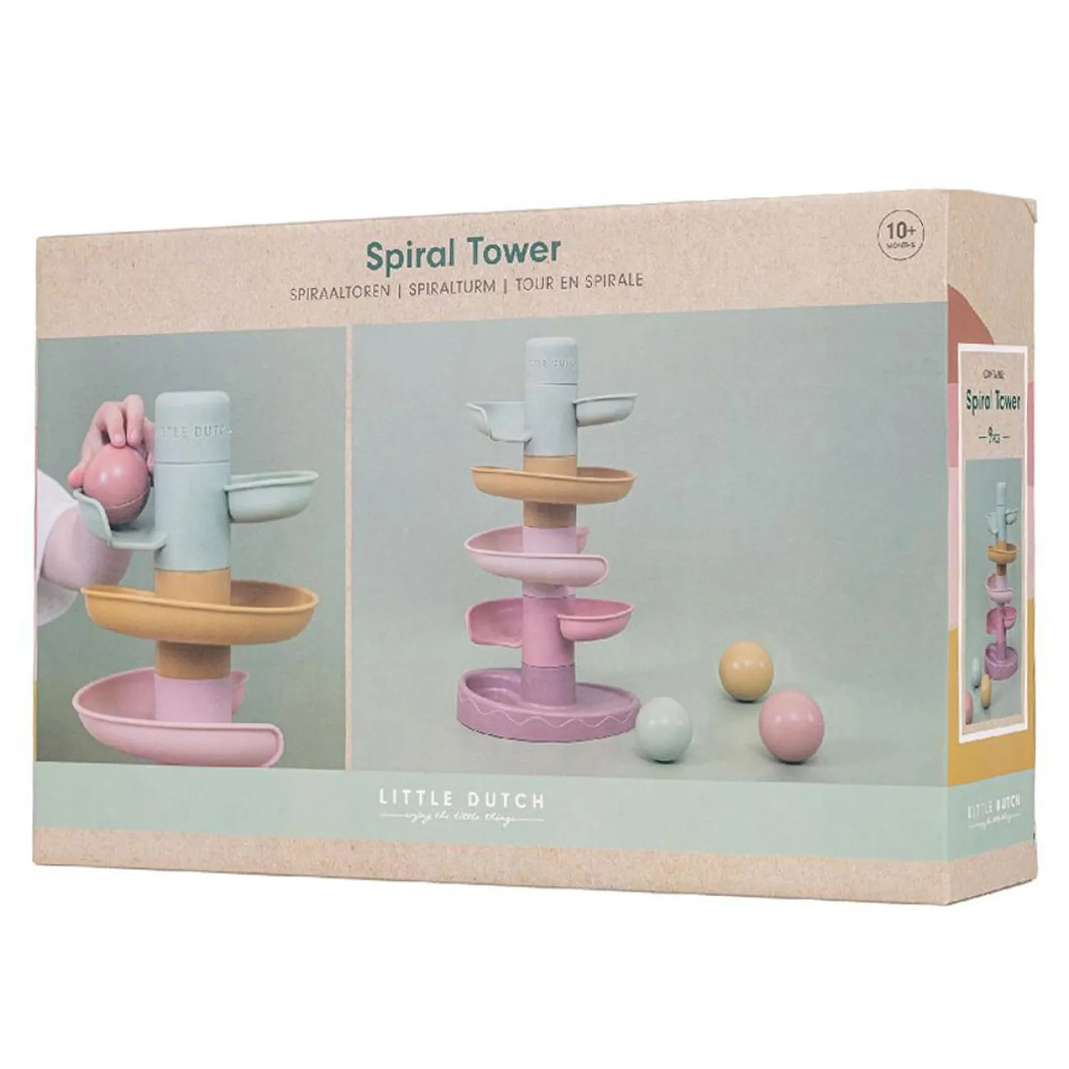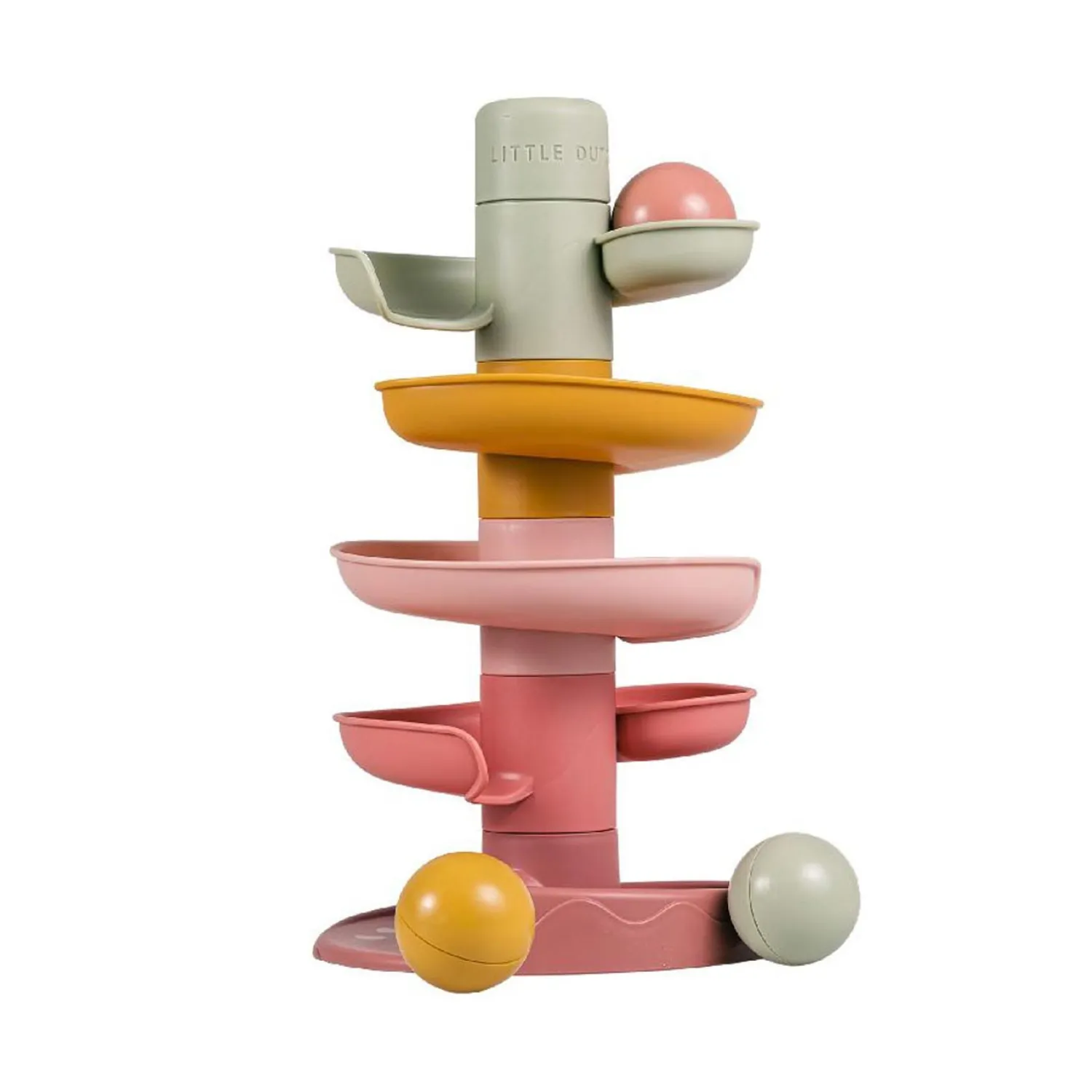 Laat de bal maar rollen! De spiraaltoren van Little Dutch zorgt voor eindeloos veel speelplezier. Deze kleurrijke set bestaat uit 5 subtiel gekleurde delen die jouw kleintje gemakkelijk op elkaar stapelt. Laat de ballen een voor een op de bovenste laag vallen en kijk hoe ze achter elkaar naar beneden rollen en slingeren. De spiraaltoren draagt bij aan de ontwikkeling van de hand-oog coördinatie en leert kleintjes over oorzaak en gevolg, waarmee het zowel leuk als leerzaam spelen is. Bij de spiraaltoren zitten standaard 3 lichte en gemakkelijk vast te pakken ballen in verschillende kleuren die bij beweging een geluidje maken. Dit speelgoed is uitgevoerd in de kenmerkende Little Dutch kleuren oudroze, roze, lichtroze, groen en okergeel. De afmeting is: 18 x 18 x 30 cm. Wordt geleverd in full-colour doos. Geschikt voor kinderen vanaf 10 maanden.