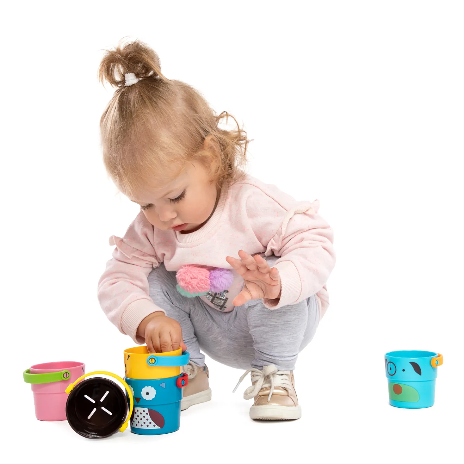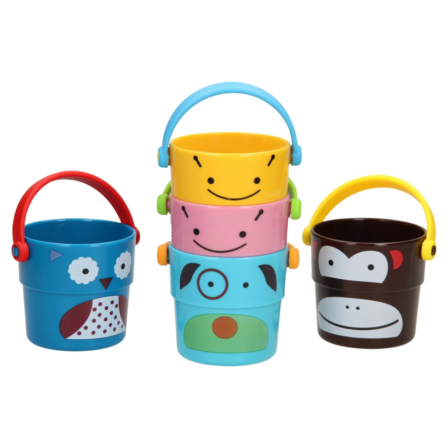 Spetterspeelplezier gegarandeerd met de Stapel Badbekers! De set bestaat uit 5 kleurrijke kunststoffen bekers met handvat. Er staan afdrukken op van een aap, uil, lieveheersbeest, hond en bij. Aan de onderkant van de 5 Stapel Bademmers zitten gaatjes, zodat het water er uit stroomt tijdens het badderen.