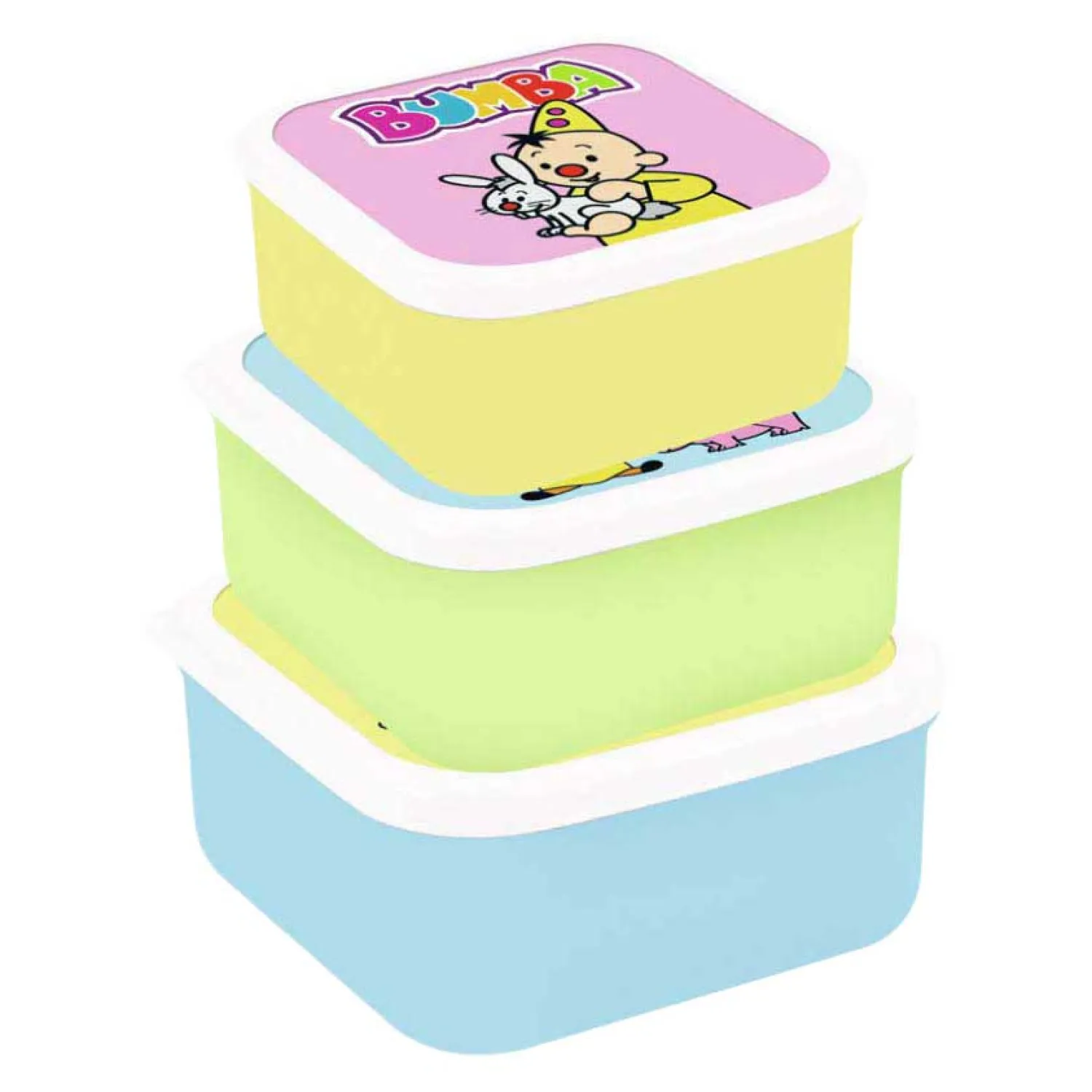 Met deze vrolijke Bumba bewaardoosjes wordt het opruimen en meenemen van snacks of kleine spulletjes extra leuk! De set bestaat uit drie doosjes in verschillende formaten en kleuren, elk met een vrolijke Bumba-afbeelding op de deksel. Ideaal voor fruit, koekjes of kleine schatten. De doosjes passen handig in elkaar en nemen zo weinig ruimte in.