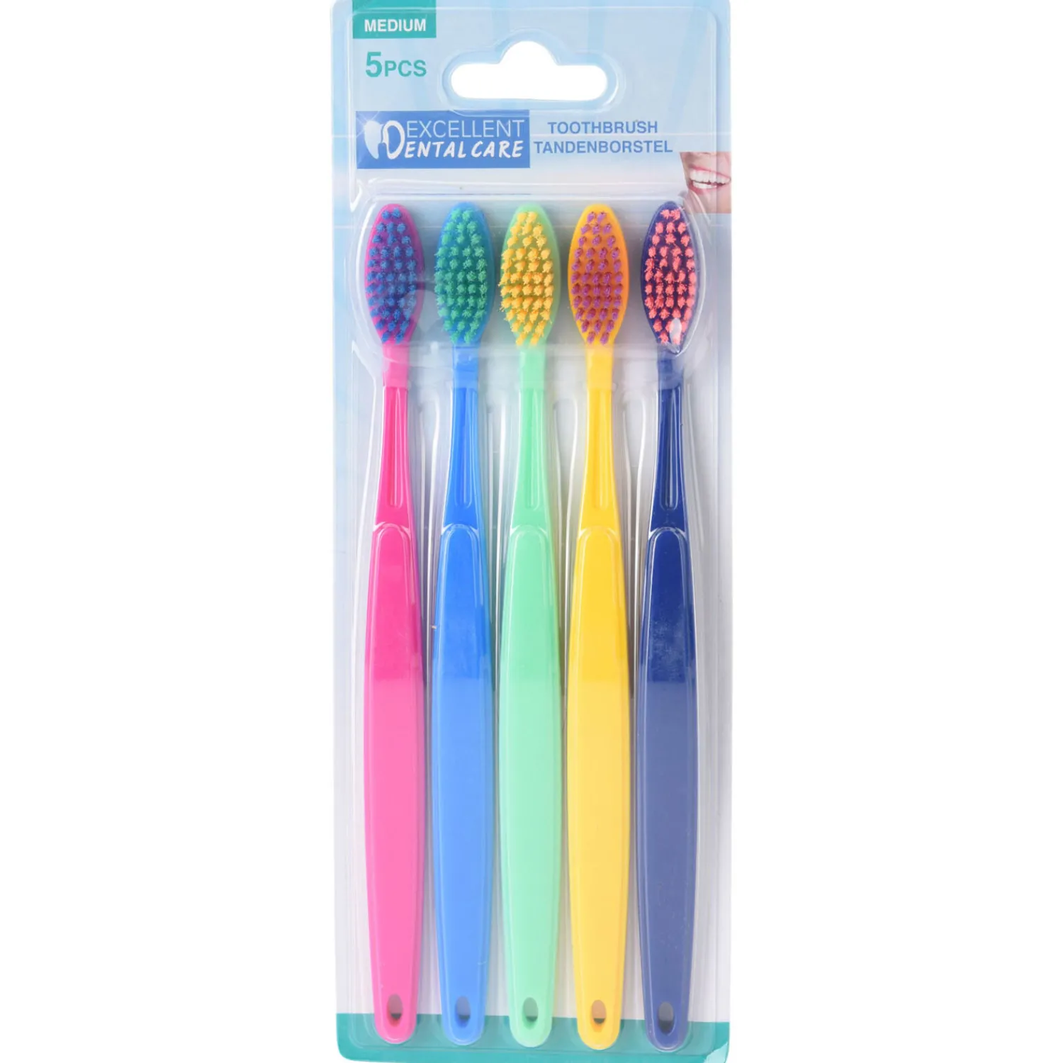 Kleurrijke set van 5 medium kunststof tandenborstels, ideaal voor het hele gezin.