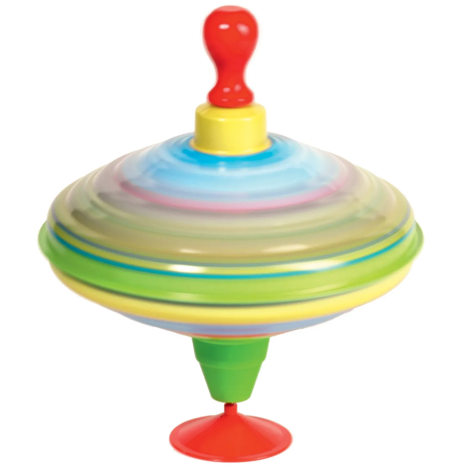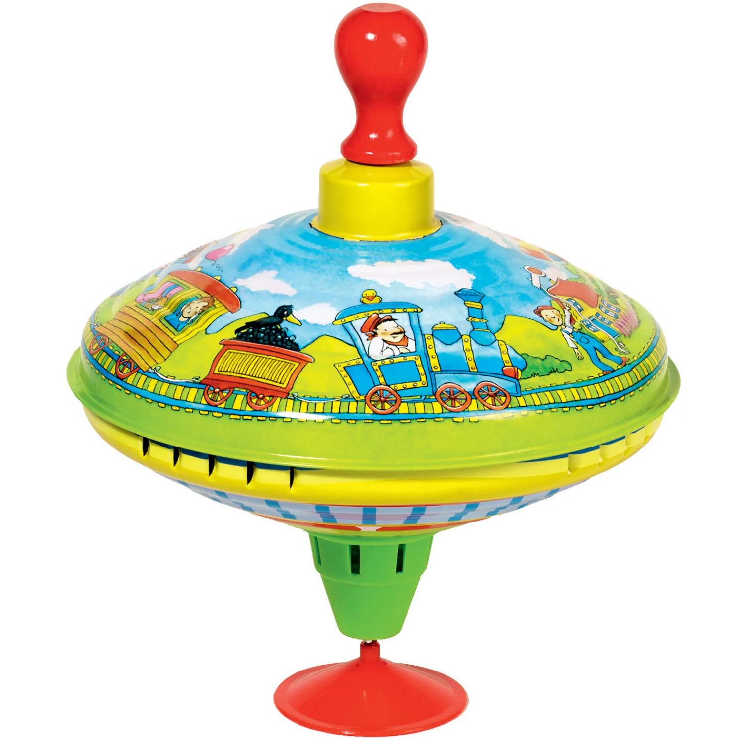 Trek aan de houten nop van deze tol en zie hoe de metalen tol super snelle rondjes begint te draaien op zijn voet. De print van de vrolijke trein op de buitenzijde draait net zo snel in het rond voor eindeloos plezier!