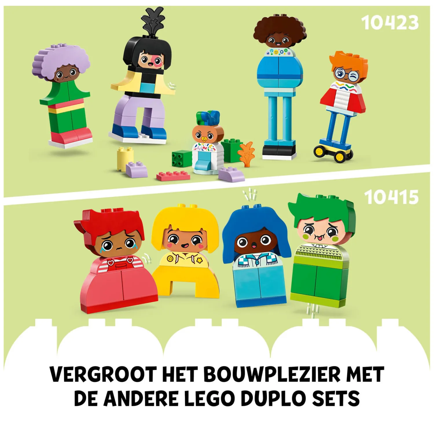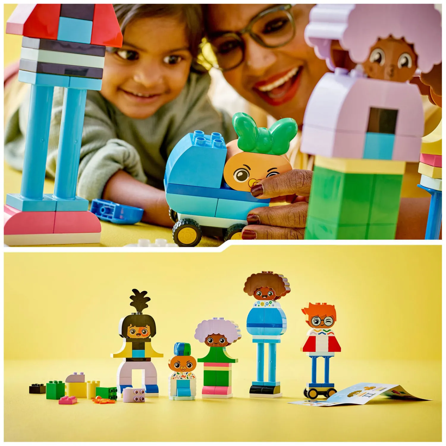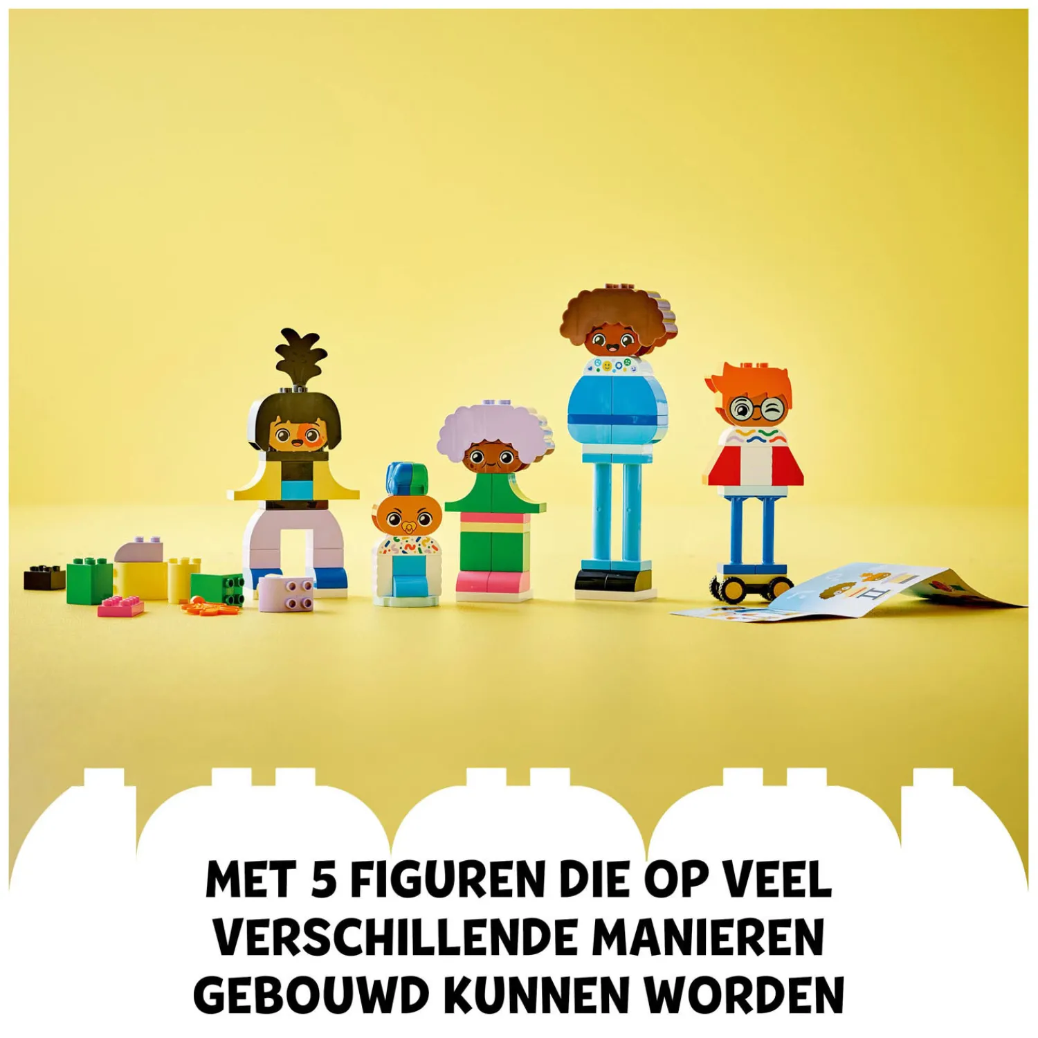 Deze set bevat 71 stenen en onderdelen om 5 bouwbare personages te maken, waaronder 5 pruikstenen en 1 wielbasis. De verbeelding van peuters groeit terwijl ze lichamen, benen, gezichten en kapsels combineren om een eindeloze reeks vriendelijke personages te maken. Met 10 verschillende gezichtsstenen kunnen peuters uitdrukken hoe hun poppetjes zich voelen en beschrijven wat die uitdrukkingen betekenen. De set is ook een ideale manier om gesprekken te beginnen over hoe anders iedereen is!