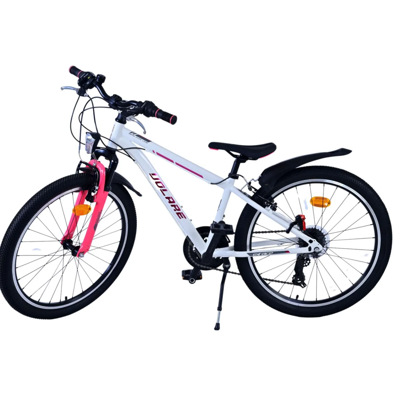 Veiligheid staat voorop! Daarom heeft deze gave fiets 2 handremmen en geen terugtraprem! Daarnaast heeft de fiets 21 versnellingen van shimano met revoshifters, reflectoren in de wielen, reflectoren voor en achter op de fiets, een bel, verlichting op batterijen voor en achter. De gekantelde stuurpen zorgt voor een beter zicht op de weg, maar is daardoor niet in hoogte verstelbaar. Ook aan het comfort is gedacht. De mooie witte Volare fiets met roze accenten heeft een comfortabel zacht zadel, een standaard zodat je fiets netjes blijft staan, en stoere extra brede banden. Om zo lang mogelijk van de fiets te kunnen genieten heeft de fiets een extra lange zadelpen waardoor de fiets nóg langer meegroeit.