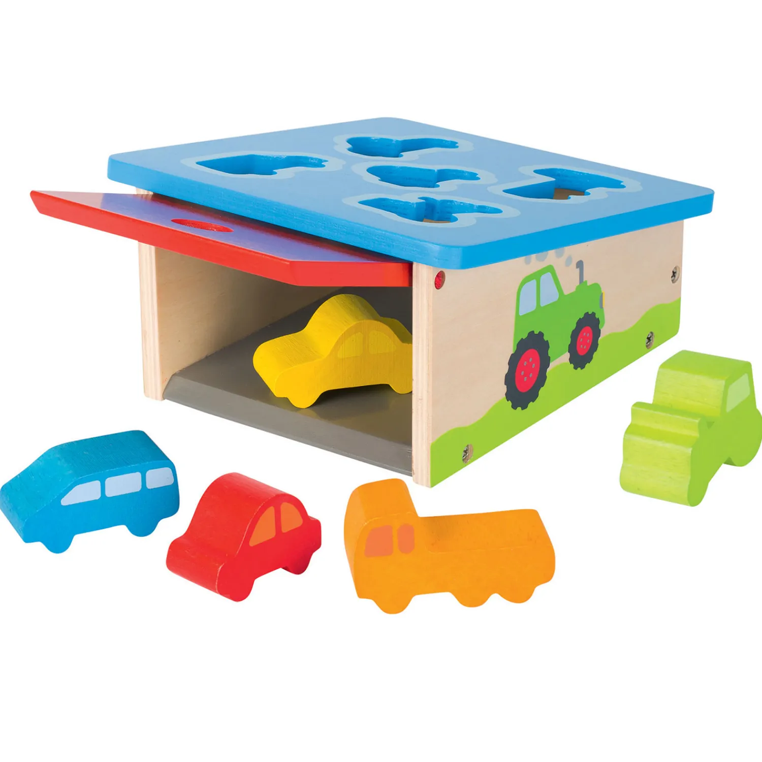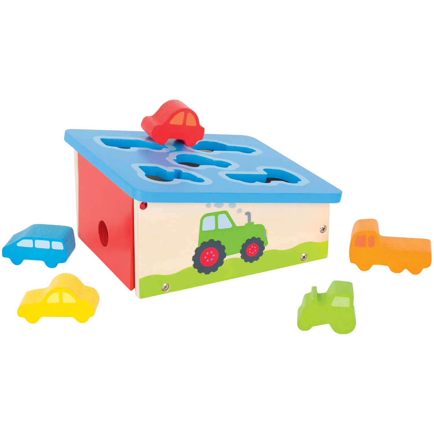 Houten vormenstoof met 5 verschillende blokken in de vorm van een auto. Zo leert je kind verschillende vormen kennen op een speelse manier. Het bevordert tevens de oog-handcoördinatie.