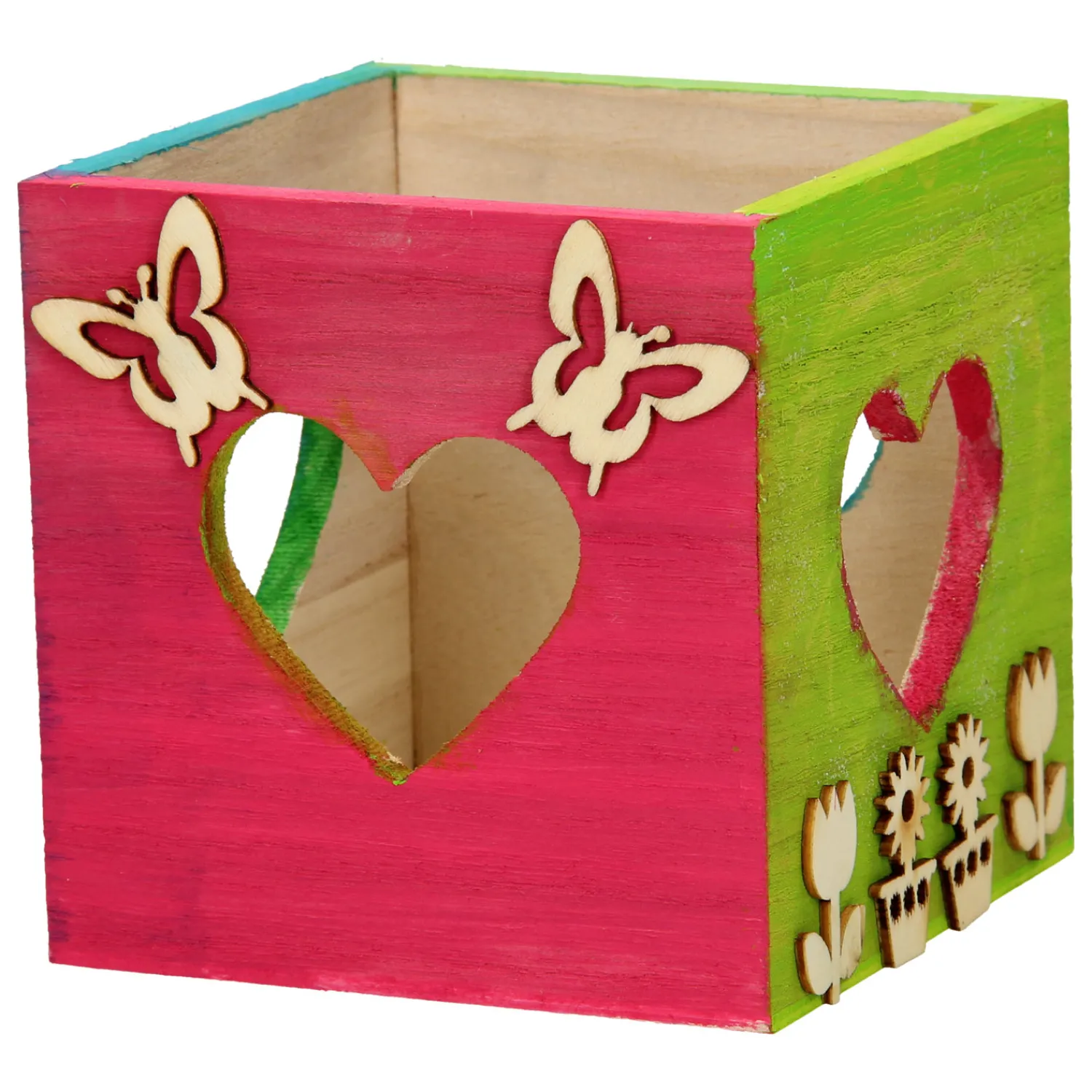 Houten waxinelichthouder met aan de zijkant uitgesneden hart vormen .