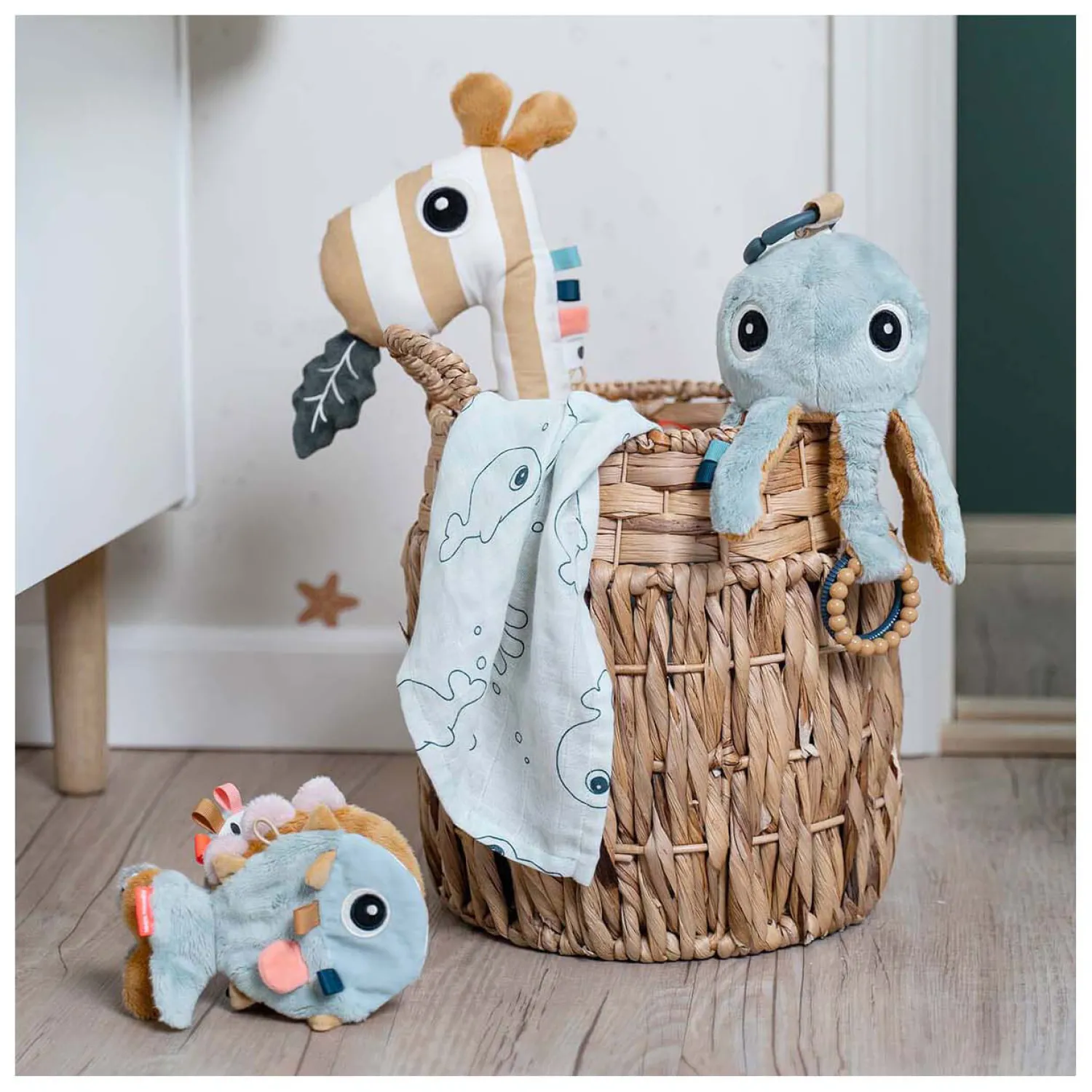 Een speelse mix van blauwe, poeder- en mosterdkleurige zeedieren en contrasterende afbeeldingen om het gezichtsvermogen van uw baby te stimuleren